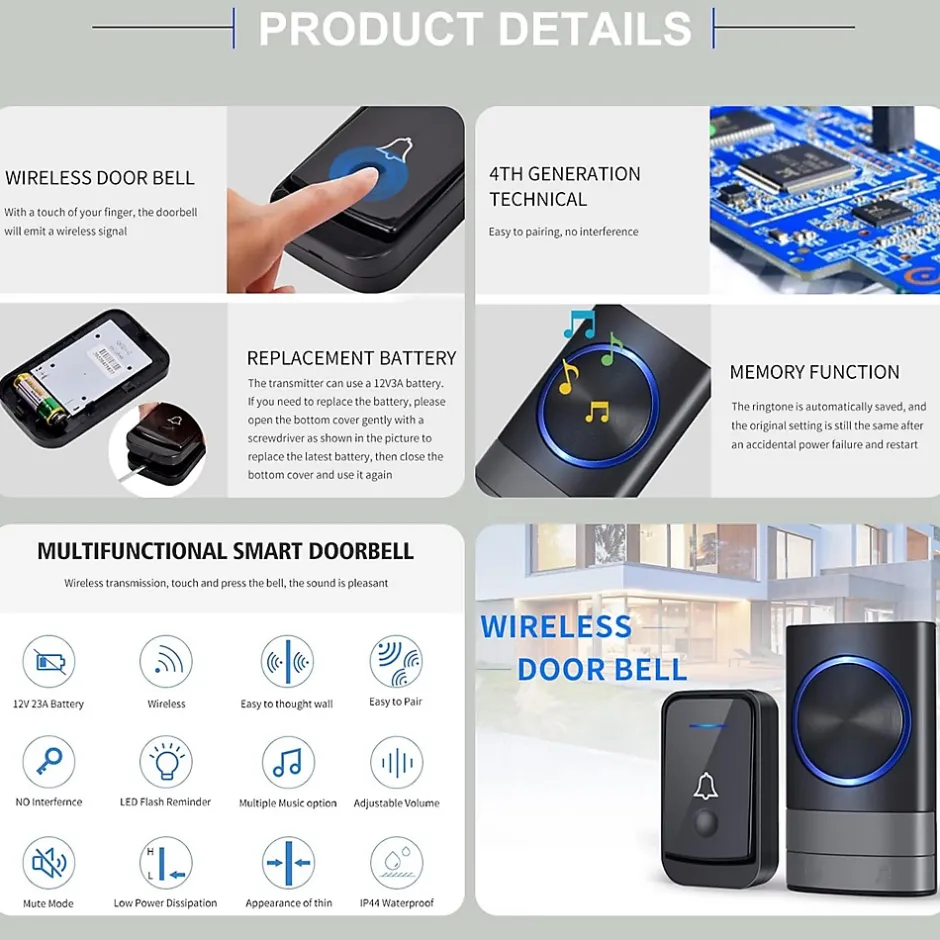 52 Titres, 4 Niveaux De Volume : Cette sonnette de porte sans fil dispose de 52 sonneries mélodiques du monde entier, qui peuvent être changées en appuyant sur un bouton. Ce produit a quatre niveaux de volume réglables (y compris le mode silencieux), et a également un flash bleu, le mode silencieux flash s’allume toujours pour répondre à vos différents besoins.Portée De 400 Mètres : Le signal sans fil peut être transmis dans une très grande portée de 400 mètres (en zone ouverte), et en même temps la capacité du signal à pénétrer le mur est bonne, le signal peut couvrir complètement votre maison sans interférence d’autres appareils.Fonction Mémoire : Cette sonnette de porte sans fil enregistre automatiquement la sonnerie et le volume que vous avez réglés et redémarre automatiquement après une coupure de courant accidentelle ou après avoir été débranchée et rallumée, sans que vous ayez besoin de la réinitialiser à vos préférences.étanche à L’eau Et à La Poussière : Avec la fonction IP44 étanche à l’eau et à la poussière, il peut garantir la sonnette de porte sans fil peut normalement être utilisé à l’extérieur. La température de fonctionnement va de -35°C à 65°C, ce qui permet de résister au mauvais temps, une haute qualité et une faible consommation d’énergie.SI VOUS NE POUVEZ PAS VOUS CONNECTER, COMMENT REFAIRE L’APPAIRAGE :Après avoir mis en marche l’émetteur et le récepteur, appuyez sur le bouton de volume du récepteur sans le relâcher et appuyez en même temps sur l’émetteur, l’appairage sera réussi dans les 3 secondes. Lorsque vous appuyez sur l’émetteur à ce moment-là, le récepteur sonne, ce qui signifie que l’appariement est réussi.