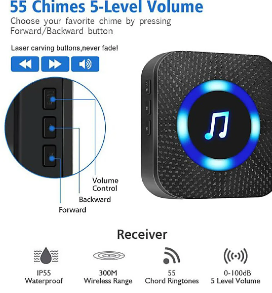 【Signal Fort, Partout】Notre sonnette offre une portée puissante de 300 mètres dans les zones ouvertes, vous assurant d’être toujours en contact. Que vous soyez dans le jardin, à l’étage, ou même au sous-sol, ne manquez jamais un visiteur à nouveau.【Son Personnalisé, Modes Flexibles】Profitez d’un contrôle précis avec 5 niveaux de volume jusqu’à 100 dB, parfait pour les personnes malentendantes ou âgées.Sans batterie