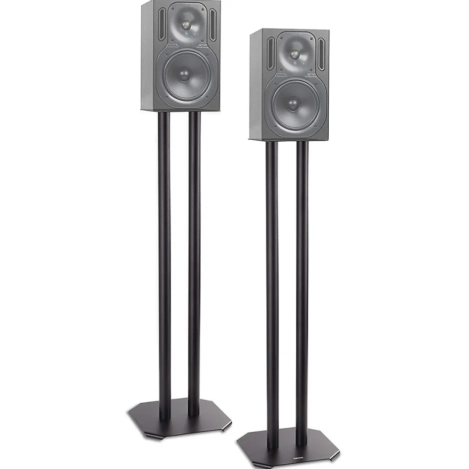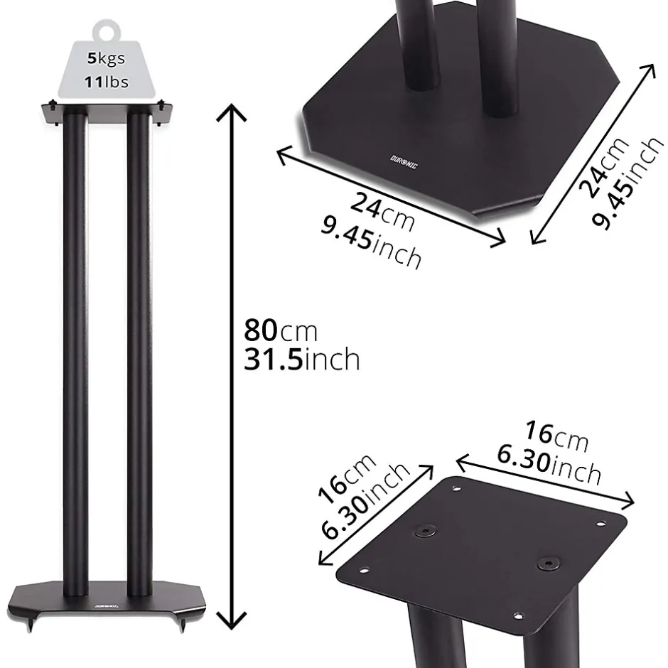 Ce support est construit en acier pour une stabilité maximale. Pour améliorer le son et réduire les résonances, les colonnes sont vides et peuvent donc être remplies de sable au 2/3 afin d’affiner le son produit par les enceintes. Outre leur fonction pratique, les pieds denceinte Duronic apportent une touche esthétique grâce à leur conception simple, sobre et discrète.Obtenez un son de qualité sur tous les sols. Qu’il s’agisse de tapis, de vinyle, de bois ou de stratifié, ces supports vous permettront d’obtenir une bonne qualité sonore sur toutes les surfaces. Sur la base et la plate-forme du stand, 4 pointes – également appelées cônes – jouent un rôle crucial pour réduire les vibrations causées par les haut-parleurs mais aussi pour assurer un maximum de stabilité sur tout type de sol.Sur sols durs, des rondelles ont été fournies pour éviter de rayer le sol. De nombreux audiophiles et spécialistes recommandent néanmoins d’utiliser les pointes et d’ajouter une pièce en-dessous de ces pointes. Ceci a pour but de dissiper les vibrations au maximum et d’améliorer ainsi la profondeur des basses. Sur moquettes et autres sols mous, les pointes peuvent également être utilisés pour assurer la stabilité de l’ensemble.Supports de haut-parleur de taille moyenne. Fourni par paires. Fabriqué à partir de matériaux durables en acier. Hauteur: 80 cm Largeur de la base: 24 cm. Largeur de la plateforme: 16 cm. Charge maximale à vide: 5 kg. Ces supports ont été testés avec des équipements de 50 kg auquel cas il est recommandé de remplir les colonnes avec du sable). Autres tailles disponibles: 40 cm et 60 cm.