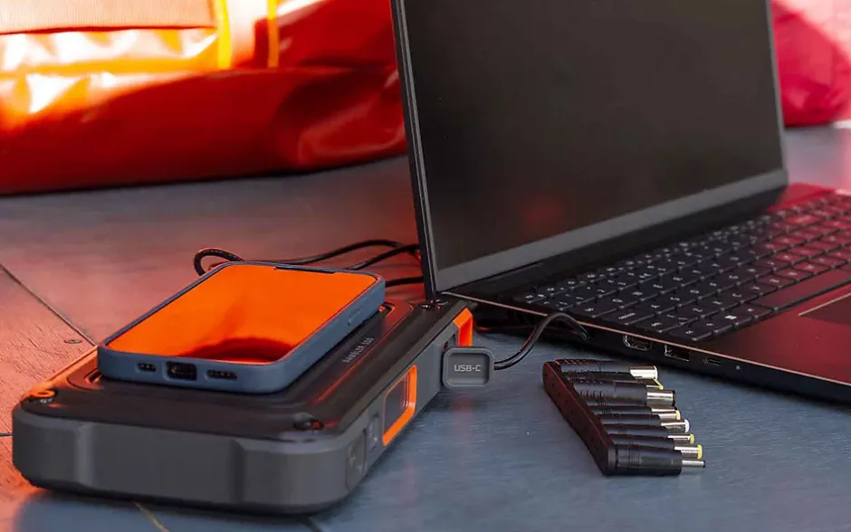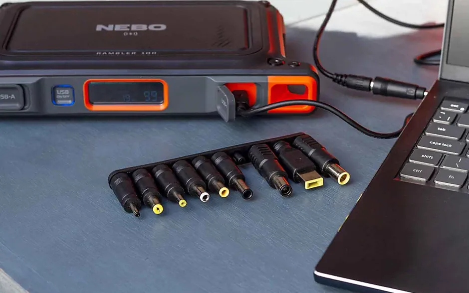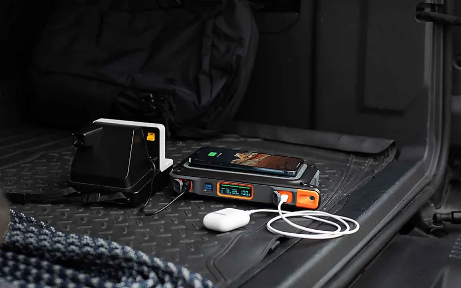 Avec une puissance de 94,9 wattheures, elle est très compacte et répond aux critères d’approbation des bagages à main, ce qui vous permet de rester alimenté à l’aérogare et à 30 000 pieds d’altitude. Le projecteur intégré en fait un excellent outil de secours pour éclairer et alimenter les appareils essentiels en cas de panne de courant, et il peut même être rechargé à l’aide d’un panneau solaire (vendu séparément). CONCEPTIONFonction de charge directe (possibilité de charger l’appareil et un appareil en même temps.) Affichage numérique de l’alimentationPort de charge bidirectionnel USB-C (Power Delivery)2 ports de charge USB-AStation d’accueil pour la charge sans fil3 modes d’éclairage FONCTIONNEMENTBouton ON/OFF ACCESSOIRESCâble USB-C vers USB-CCâble USB-C vers CC (DC)Adaptateurs de chargeur pour ordinateur portableChargeur de voiture 12 VAdaptateur de charge Royaume-Uni/UE BATTERIEAlimentée par une batterie Li-ion de 26 000 mAh TEMPS DE RECHARGE3-4 heures PORTSEntrée / Sortie : 1x USB-C PD | 45WSortie : USB-A | 5V 2.4ASortie : 1x station de charge sans fil | 10W max