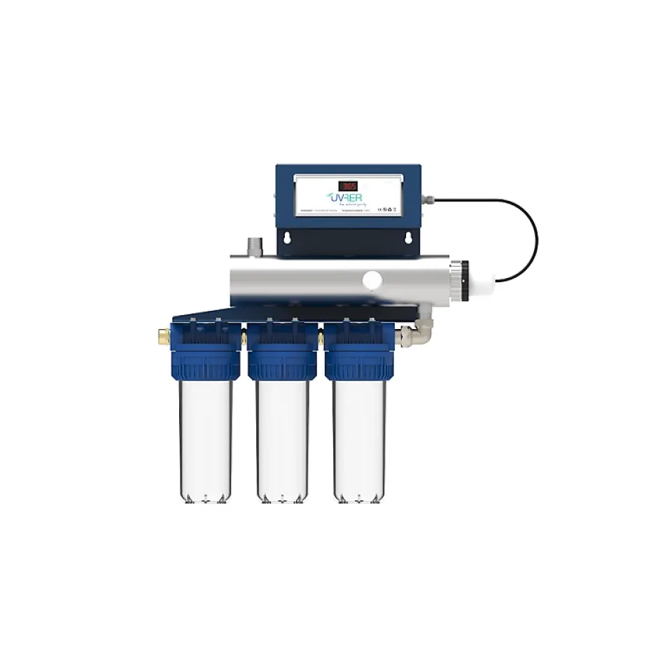 Station de traitement UV pour eau de forage, de puits ou de pluie : Modul’eau UVRERL’eau d’alimentation peut contenir une grande quantité de micro-organismes inoffensifs maiségalement pathogènes (streptocoques fécaux, coliformes fécaux, légionnelles…).Pour que l’eau soit potable, il est nécessaire d’enlever complètement ces bactéries.Le traitement de l’eau par ultraviolets est un procédé 100 % physique qui imite l’effet assainissant de la lumière solaire par des lampes UV.FABRICANT : UVRERFonctionnement : Livré avec une une lampe UV 3,7m3/heure qui assainit l’eau.Cartouches de filtration à rajouter en fonction de vos besoins mais généralement il faut mettre : 1 filtre 5µ (03010005) , 1 filtre 20µ (03010007) et un filtre charbon actif (03020000).Applications :Traitement d’eau brute (forages, captages, puits…)Sécurisation d’eau de pluie (usage sanitaire uniquement)Sécurisation d’eau de réseau Caractéristiques :Chambre de traitement inox 316 LPression max 6 barsPuissance : 1×60 WES : 3/4″Température de l’eau 0 à 40 °CRegard pour cellule de contrôleRaccordement en axe opposéGaine quartz fond bombéLampe mono-culot 9 000 hPlatine de fixation de construction métalliqueAffichage digitale avec décompte journalierAlarme visuelle et sonoreLeds vertes et rouges d’état de lampeBuzzer défaut lampeCordon d’alimentation 220 V+TVersion avec porte-filtre intégréDimensions 460 x 581 x 140 Durée de vie des consommables :Lampe UVc : 9 000 heuresJoint : 9 000 heuresGaine : 5 ansLivré sans cartouches