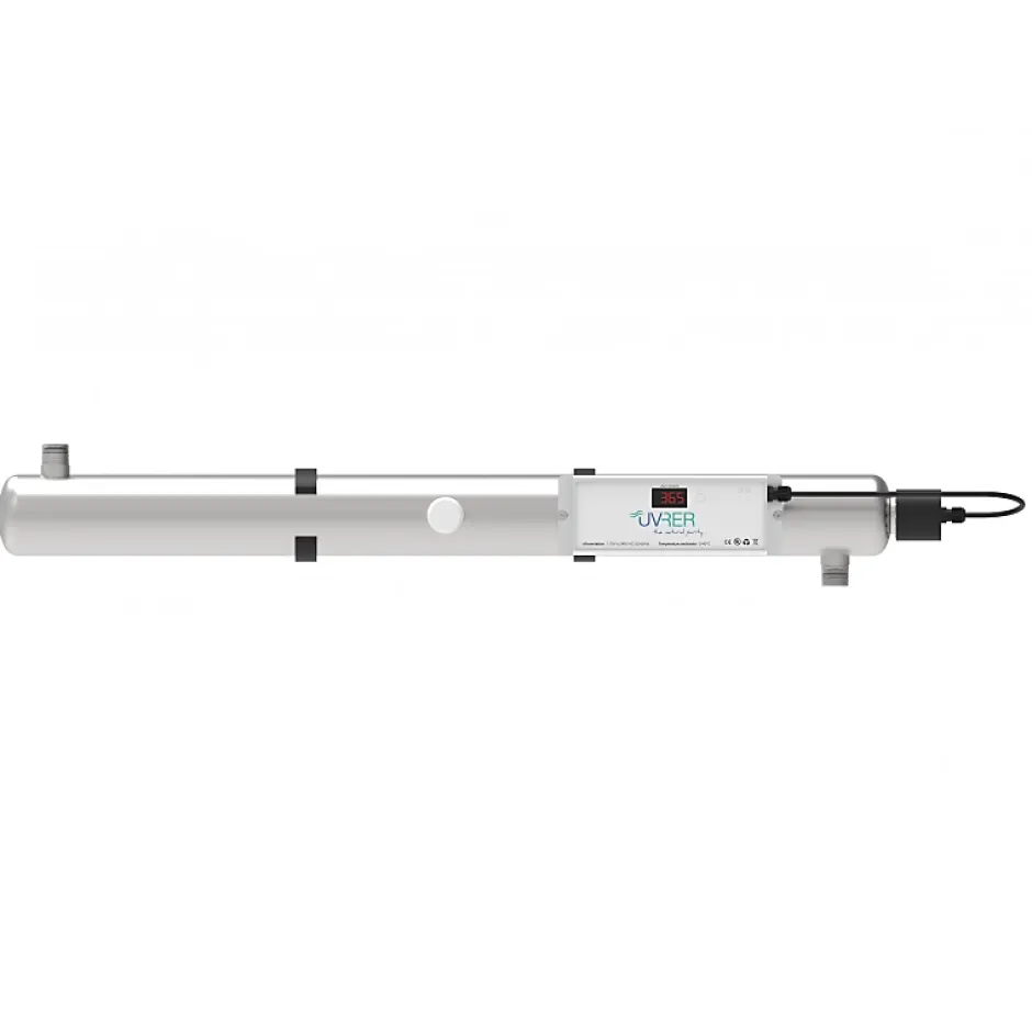 Stérilisateur UV 4m3/hLa stérilisation par ultra-violet est un procédé de traitement de l’eau 100 % physique qui imite l’effet assainissant de la lumière solaire par les lampes UV. Elles émettent des rayons lumineux avec un maximum d’intensité à 253,7 nanomètres qui permettent d’enlever complètement les bactéries présents dans l’eau pour la rendre potable.Ces stérilisateurs UV peuvent être utilisés pour traiter l’eau de forage, l’eau d’adduction ou l’eau d’un puits, contaminés par des bactéries. Pour garantir la potabilisation de l’eau, celle-ci doit être chimiquement potable avant le traitement de l’eau.Le stérilisateur UV est un réacteur chimique cylindrique fermé en inox 316 L et équipé d’une lampe à vapeur de mercure basse pression émettant dans la longueur d’onde germicide de 253,7 nanomètres et de puissance électrique de 30 Watts.L’ensemble est commandé par un coffret électrique assurant l’allumage de la lampe, son fonctionnement et le comptage des heures de fonctionnement.Le stérilisateur doit être installé horizontalement. Il est recommandé de le fixer au mur.FABRICANT : UVRERApplications :Traitement d’eau brute (forages, captages, puits…)Sécurisation d’eau de pluie (usage sanitaire uniquement)Sécurisation d’eau de réseauCaractéristiques :Chambre de traitement inox 316 LPression max 6 barsTempérature de l’eau 0 à 40 °CRegard pour cellule de contrôleRaccordement en axe opposéGaine quartz fond bombéLampe mono-culot 9 000 hCoffret électrique fixé sur la chambreAffichage digital avec décompte journalierAlarme visuelle et sonoreLeds vertes et rouges d’état de lampeBuzzer défaut lampeCordon d’alimentation 220 V+TDurée de vie des consommables :Lampe UVc : 9 000 heuresJoint : 9 000 heuresGaine : 5 ans Fréquences consommables