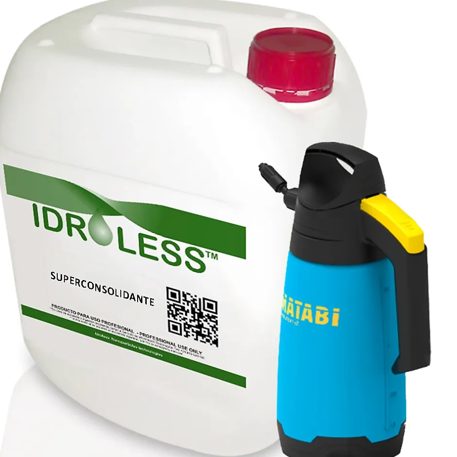 ❗ Superconsolidant sans solvant Idroless : Compactage des surfaces humides et absorbantes avec désagrégation, sans changer leur aspect natural ❗Le Superconsolidant d’Idroless est un compresseur incolore, inodore et sans solvants à appliquer sur tous types de surfaces et tout support minéral absorbant. Ce produit est idéal pour les caves et sous-sols où les murs et les plafonds se décomposent en raison de l’humidité due aux infiltrations du sol, car il présente une pénétration profonde et active où il cristallise, renforce et arrête efficacement l’absorption d’eau dans le support. Ce compacteur pénètre activement et en profondeur. Il s’agit d’un agent de consolidation permanent et insoluble qui ne se lave pas, ne se dégrade pas et ne diminue pas son rendement au fil du temps. Une fois appliqué s’intègre chimiquement dans la structure qui reste respirante, sans film et en conservant son aspect naturel. Ce produit est inodore, incolore et ne contient pas de solvants.⁉️ Comment appliquer le Superconsolidant d’Idroless?Avant, la surface doit être bien nettoyée. Il faut éliminer les traces de poussière, de graisse, de peinture ou tout revêtement susceptible d’endommager l’absorption du support. Le verre, l’aluminium et les autres surfaces doivent être protégés par un plastique protecteur.Une fois la surface nettoyée, le produit est appliqué. Le compacteur de surface est prêt à l’emploi, ne se mélange pas avec d’autres liquides et ne se dilue pas. Appliqué avec pulvérisateur basse pression ou rouleau. L’application est de humide sur humide sur au moins 2 couches : une première couche abondante et, avant qu’elle ne sèche, une deuxième couche est appliquée jusqu’à saturation du support. L’intervalle entre les deux mains doit être de 5 à 15 minutes. Une fois prêt, la zone traitée peut être réutilisée en 30 minutes, lorsque la surface est complètement sèche. La température pendant l’application et les 24 heures suivantes doit être comprise entre 5ºC et 40ºC.