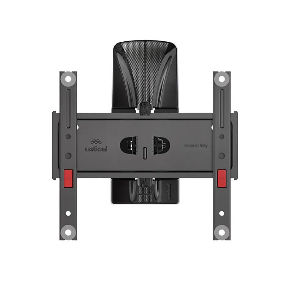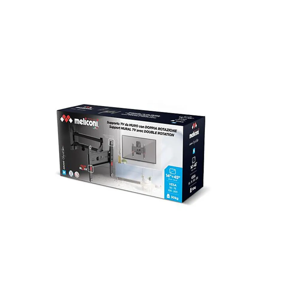 Support mural robuste et universel Meliconi GSDR200-PLUSFB, conçu en acier renforcé avec traitement anti-corrosion. Compatible avec TV de 14 à 40 pouces, VESA 50/75/100/200, charge maximale supportée 30 kg. Installation facile avec visserie Fischer et niveau inclus. Inclinaison réglable +/- 10°, orientation +/- 90°, système de gestion de câbles intégré. Protection en mousse EVA, mécanisme sécurisé anti-basculement et design ultra-mince pour installation discrète. Garantie 10 ans.