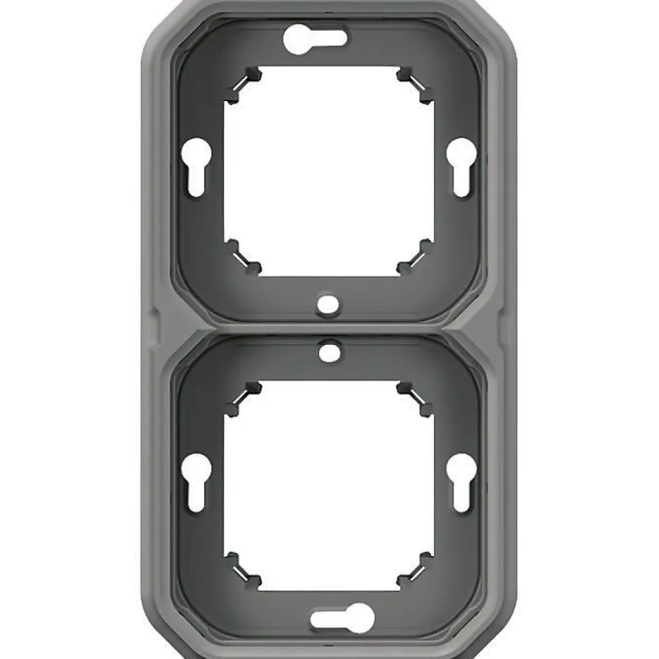 Support plaque étanche PLEXO Legrand pour montage encastré 2 postes horizontaux ou verticaux, modèle gris RAL 7046, avec protection IP55, fixation à vis, adapté aux environnements humides, matériau thermoplastique de qualité, finition mate, températures d’utilisation entre -10 et 40 °C, poids 100 g.