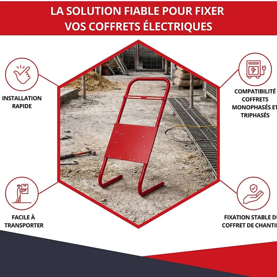 Support pour coffret de chantier monophaséLe support pour coffret de chantier monophasé est conçu pour assurer une installation stable, sécurisée et pratique de votre coffret électrique sur tous types de chantiers.✅ Caractéristiques principales :Compatibilité : adapté aux coffrets électriques monophasés standardsDimensions : H. 635 x L. 265 mmCouleur : rouge, pour une visibilité renforcée sur chantierRobustesse : structure en acier galvanisé pour une excellente résistance aux chocs et aux conditions extérieuresStabilité : pieds renforcés assurant un maintien optimal, même sur sols irréguliersPraticité : montage et démontage rapides, transport facileSécurité : garantit une bonne hauteur d’installation pour respecter les normes et limiter les risques️ Utilisations :Travaux de construction et rénovationChantier résidentiel ou professionnelInstallations temporaires nécessitant une alimentation monophasée fiable Avantages :Gain de temps sur l’installationSécurité accrue pour les utilisateursConçu pour durer, même en conditions difficiles