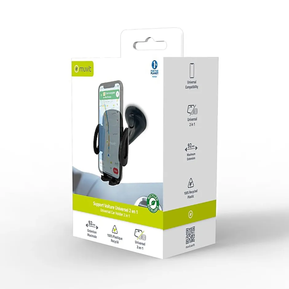 Support Voiture Universel 92mmCe support voiture noir de marque Muvit est compatible avec tout Smartphone d’une largeur maximale de 92mm. Il dispose d’une pince extensible favorisant une fixation stable de votre mobile. Ce support est compatible avec tout type de grilles d’aération, de pare-brise et de tableaux de bord. Rotatif à 360°, il permet un angle de vue ajustable en fonction de votre préférence.En résumé :Compatible avec tout Smartphone d’une largeur maximale de 92mm.Conçu avec un mélange de polyuréthane, de silicone, de plastique et de métal, lui conférant résistance et durabilité.Rotatif à 360°, permettant un angle de vue ajustable en fonction de votre préférence.Dispose d’une pince extensible favorisant une fixation stable de votre mobile.
