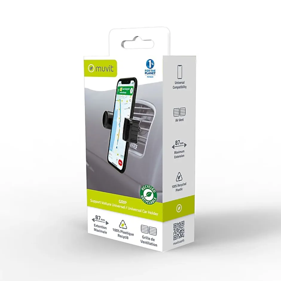 Support Voiture Universel GripCe support voiture Grip noir de marque Muvit est compatible avec tout Smartphone ayant une largeur entre 50 à 87mm. Il dispose d’une pince extensible jusqu’à 87mm, favorisant un maintien stable de votre mobile. Ce support peut être solidement fixé sur tout type de grilles d’aération. La rotation à 360 degrés permet d’obtenir l’angle de vue parfait.En résumé :Compatible avec tout Smartphone ayant une largeur entre 50 à 87mm.Dispose d’une pince extensible jusqu’à 87mm, favorisant un maintien stable de votre mobile.Peut être solidement fixé sur tout type de grilles d’aération.Permet d’avoir l’angle de vue parfait grâce à sa rotation 360°.