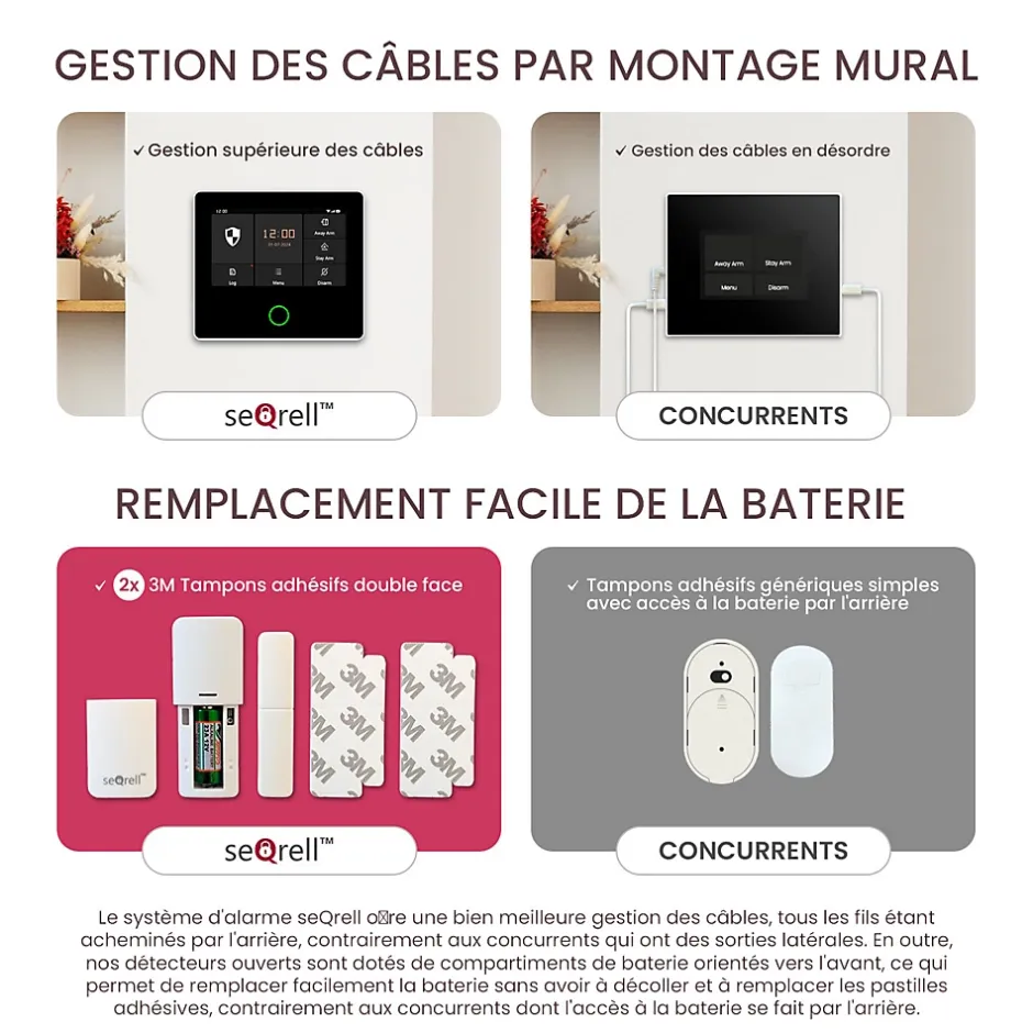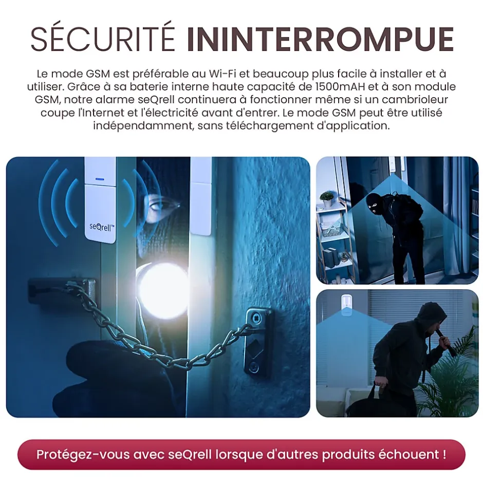 seQrell SQ4324C – kit de système d’alarme sans fil – votre système de surveillance fiableSécurisez votre maison avec notre système d’alarme complet. Notre système de sécurité professionnel de 10 pièces vous offre une protection maximale, que ce soit dans votre maison, votre appartement ou votre garage. Avec un écran tactile de 4.3 pouces, un contrôle par application, un module GSM 4G, de puissantes batteries intégrées de 1500 mAh et une variété de capteurs, vous avez la sécurité que vous et votre famille méritez. Grâce aux instructions d’installation initiale faciles à comprendre, vous pouvez effectuer la configuration de base en 10 minutes – sans faire appel à un technicien.Les atouts majeurs de notre produit : • Sécurité maximale : Le module GSM 4G intégré et la batterie de 1500 mAh offrent une protection même si un attaquant coupe l’alimentation électrique et l’Internet avant d’entrer dans les locaux. • Protection complète : Un jeu de 10 pièces comprenant 5 Capteurs de portes et fenêtres, 1 détecteur de mouvement PIR, 1 sirène WLAN, 2 télécommandes, 1 câble USB, 2x adaptateurs secteur, accessoires de montage/petit tournevis, 2 autocollants de fenêtre seQrell et un guide rapide. Vous pouvez étendre le kit à 160 capteurs et appareils différents pour le système de maison intelligente. • Laissez vos animaux de compagnie pesant jusqu’à 20 kg à la maison sans vous soucier des fausses alarmes. • Installation facile : Aucun professionnel n’est nécessaire – prêt à l’emploi en seulement 10 minutes grâce au guide de démarrage rapide inclus. • Accès à distance via l’application : Contrôlez et surveillez votre système en toute simplicité depuis n’importe où grâce à l’application Android ou iOS. • Grande facilité d’utilisation : La commande peut se faire via une télécommande ou directement sur l’appareil, même sans application. • Le détecteur de fuites d’eau vous avertit très tôt de la présence de fuites dans la maison.