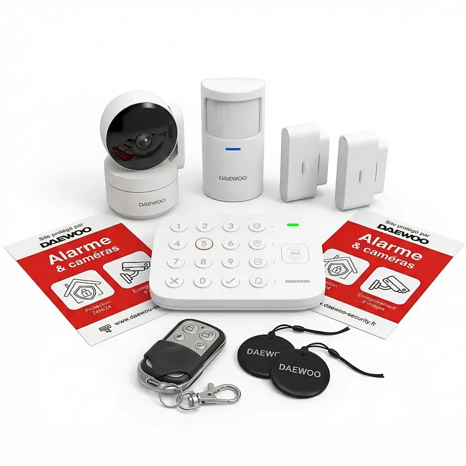 Starter Pack Alarme & Vidéo Daewoo Vigilia : La sécurité sans contrainteProtégez votre domicile avec le pack Vigilia, un système sans fil performant et 100 % sans abonnement. Vous êtes propriétaire de votre matériel : aucune mensualité, aucun engagement, pour une maîtrise totale de votre budget.⭐ Les points forts pour votre quotidien :-Mode Maison (Armement partiel) : Dormez sereinement en sécurisant uniquement vos accès. Ce mode active les capteurs de portes et fenêtres tout en laissant les détecteurs de mouvement inactifs à l’intérieur pour vous permettre de circuler librement la nuit. -Temporisation réglable : Finis les déclenchements accidentels ! Configurez un délai d’entrée et de sortie pour avoir le temps de désarmer le système .-Application unique « Daewoo Home Connect » : Pilotez l’intégralité de votre sécurité (alarme et caméras) depuis une seule interface gratuite et intuitive. -Clavier physique intégré : Une interface rassurante et accessible à tous pour armer ou désarmer le système en un clin d’œil. Contenu de votre pack essentiel : • 1 Centrale d’alarme Vigilia sans fil avec batterie et sirène intégrées • 1 Caméra intérieure IP506P Full HD avec fonction Vie Privée • 1 Détecteur de mouvement (WPS305) compatible animaux • 2 Détecteurs d’ouverture et vibration 2-en-1 (WDV301) • 1 Télécommande (WRC305) et 2 Badges RFID (WRF301) • 2 Autocollants dissuasifs⚙️ Deux versions selon vos besoins : • Version Wi-Fi : Solution idéale pour un logement avec connexion stable. Alertes et contrôle à distance via l’application. • Version Wi-Fi + GSM 4G : La sécurité infaillible. En cas de coupure Internet, la centrale bascule sur le réseau mobile (carte SIM non fournie) pour transmettre vos alertes. Parfait pour les zones isolées ou résidences secondaires. Système 100 % évolutif : Votre installation grandit avec vos besoins. Ajoutez jusqu’à 60 accessoires (sirènes, détecteurs de fumée, caméras) issus des gammes Vigilia, Touch et Touch XL.
