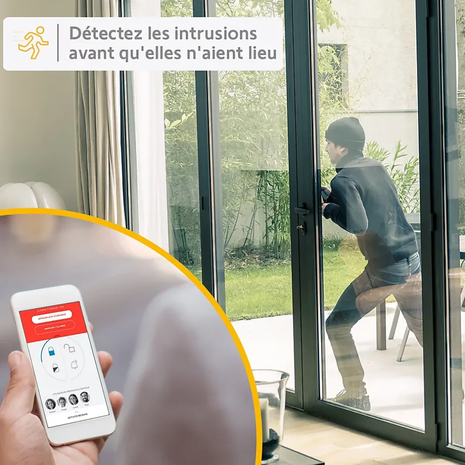 - Système de sécurité idéal pour une maison, incluant 1 sirène extérieure de 112dB, 1 sirène intérieure de 105dB, 1 détecteur de mouvement intérieur, 4 détecteurs d’ouverture IntelliTAG, 1 badge télécommande, et 1 centrale (Link).