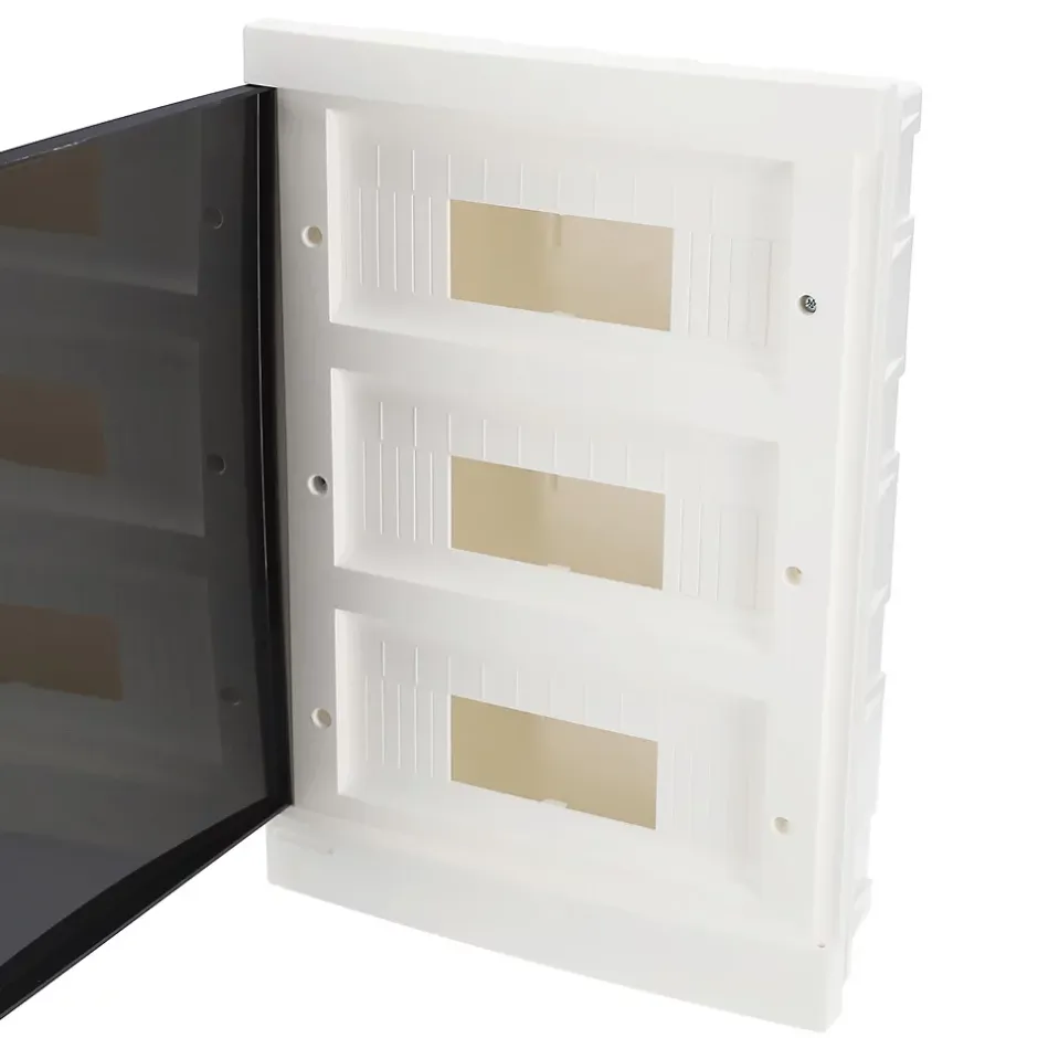 Tableau électrique encastré 36 modules (3×12 , blanc fumé | EDO777849 | EDOTableau électrique moderne et compact, alliant un design élégant et une grande fonctionnalité.Conçu pour une installation intérieure encastrée, il s’intègre harmonieusement dans le mur, garantissant une apparence soignée et une sécurité optimale pour les installations électriques domestiques et tertiaires.Spécifications techniques :✔️ Nombre total de modules : 36✔️ Nombre de rangées : 3✔️ Modules par rangée : 12✔️ Type de montage : Encastré✔️ Utilisation : Intérieure✔️ Boîtier : Blanc (RAL 9016 ✔️ Porte : Fumée, offrant une visibilité discrète sur le contenu✔️ Matériau : ABS résistant✔️ Bornes PE : Incluses✔️ Fenêtre d’inspection : Oui✔️ Classe de protection : II✔️ Degré de protection mécanique : IK08✔️ Section des conducteurs : jusqu’à 10 mm²✔️ Tension nominale : 230/400 V✔️ Tension d’isolation : 500 V✔️ Courant nominal : jusqu’à 120 ADimensions (L x H x P :✔️ Largeur : 30 cm✔️ Hauteur : 43 cm✔️ Profondeur : 9,5 cm