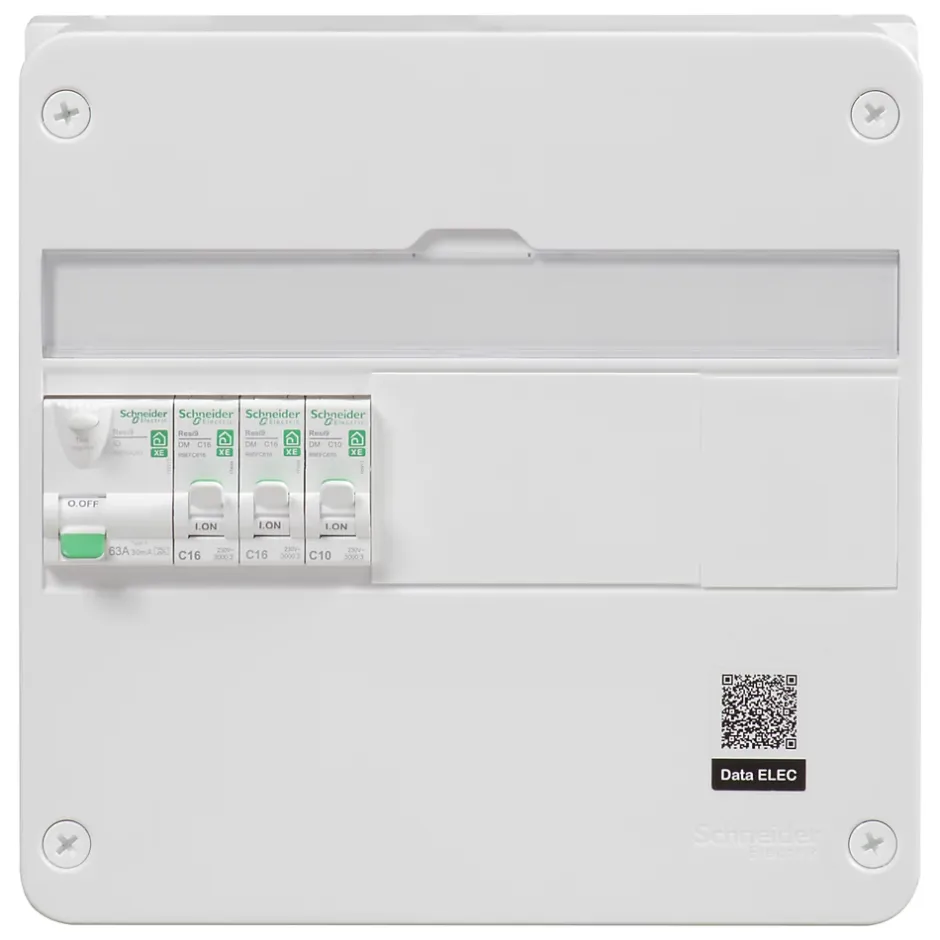 - Ce tableau électrique R9H113SE18N Schneider Electric de la gamme Resi9 est Pré-équipé et pré-câblé. Il se compose : d’un interrupteur différentiel 63A type A 30mA, d’un disjoncteur 10A courbe C, de 2 disjoncteurs 16A courbe C, et d’un répartiteur embrochable 13 modules.