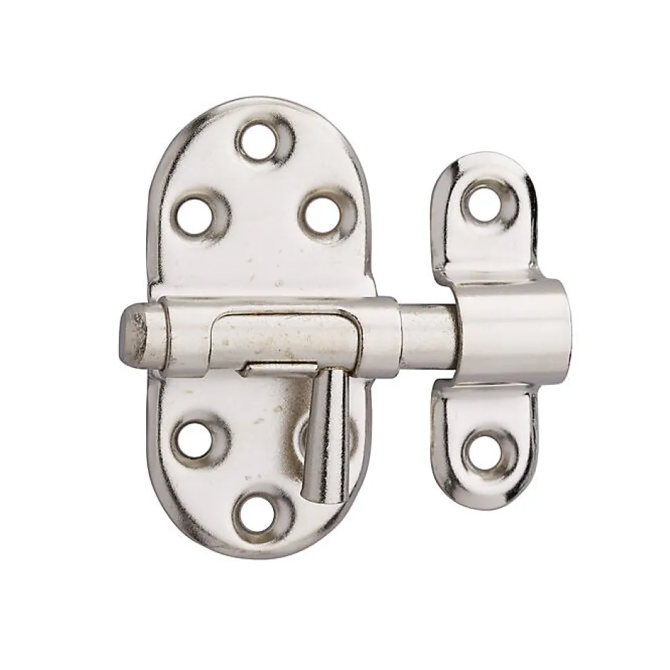 Idéal pour sécuriser les portes de meuble, les portes de placardDimension platine (h x l) : 50 x 25 mmVerrou de porte de placard, targette de meubleTargette à pêne rondEn acier finition nickelé