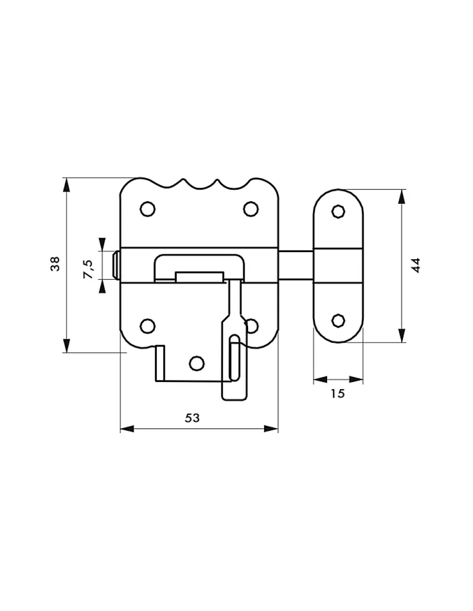 Platine acier cambré. Gâche acier cambré. Patte porte-cadenas. Pêne rond coulissant.