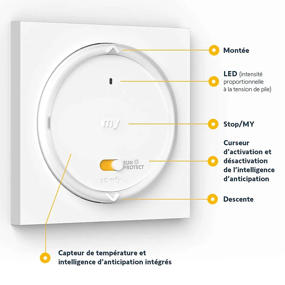 - Montée / Stop (“my” bouton) / Descente / Curseur d’activation/désactivation de la fonction « Sun protect ».
