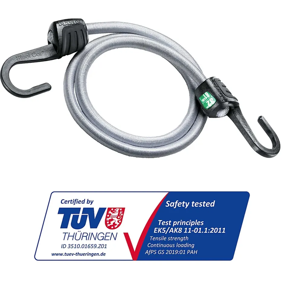 Le modèle SteelCor™ Master Lock n° 3034EURDAT est un tendeur de 80 cm avec des crochets plats en acier. Ces crochets sont trois fois plus résistants que les crochets de tendeurs traditionnels. Le design avec des crochets inversés sur le tendeur permet d’avoir un espace d’accrochage plus large. Le cordon en caoutchouc de qualité supérieure offre une robustesse et une élasticité accrues. Le tendeur peut sécuriser des charges jusqu’à 75 kg, il est étirable de 80 cm à 120 cm. Le tendeur permet de sécuriser et d’attacher des charges pendant le transport (vélo, voiture, déménagement) ou en camping. Le tendeurs Master Lock sont certifiés GS Mark : garantie de sécurité et de confiance.
