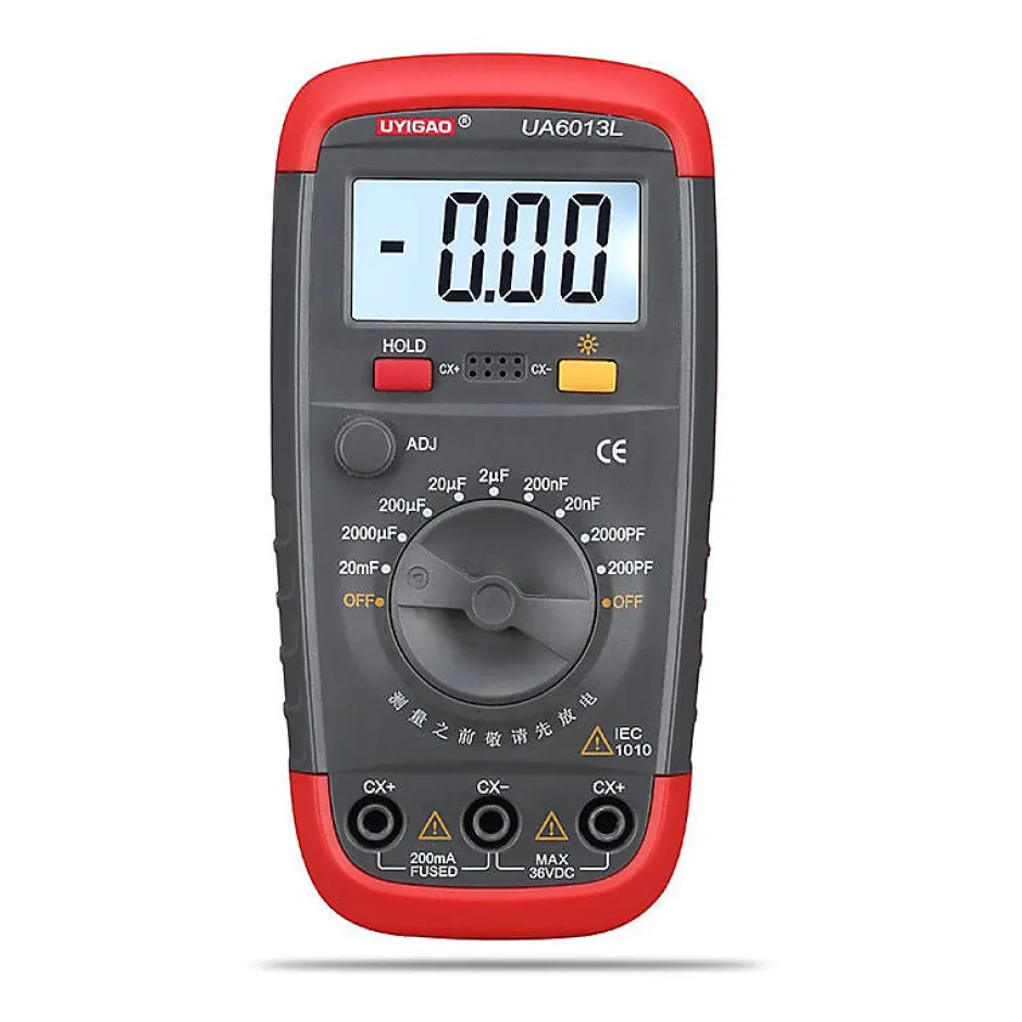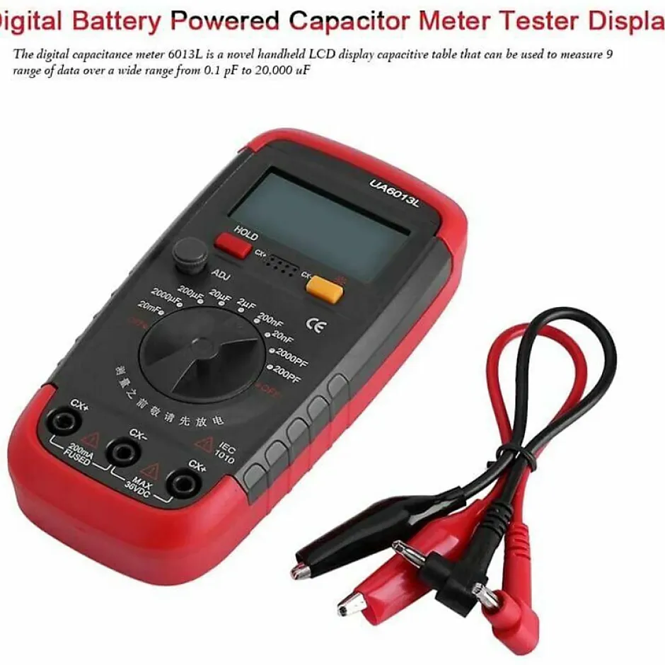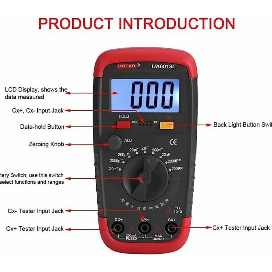 Plage de test et précision : 200pF, 2000pF, 20nF, 2uF, 20uF, 200uF (+/-0.5%+/-20 chiffres), 2000uF (+/-2.0%+/-20 chiffres), 2mF (+/-4.0 %+/-20 chiffres). Facile à utiliser : l'instrument est compact, avec une veste de sécurité, facile à utiliser et à transporter, et est un accessoire de mesure électrique idéal. Fonction de sauvegarde des données. Le bouton de réglage manuel est utilisé pour la position zéro. Application : le compteur de capacité numérique est un tout nouveau compteur de capacité à affichage à cristaux liquides portable, qui peut également être utilisé pour l'analyse numérique, la sélection de capacité, la mesure de capacité inconnue, les condensateurs correspondants, la mesure de la capacité du câble, etc.