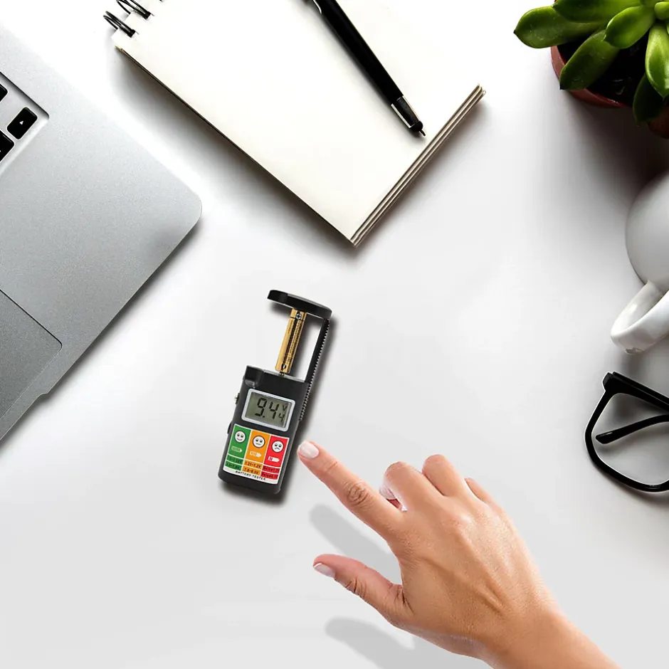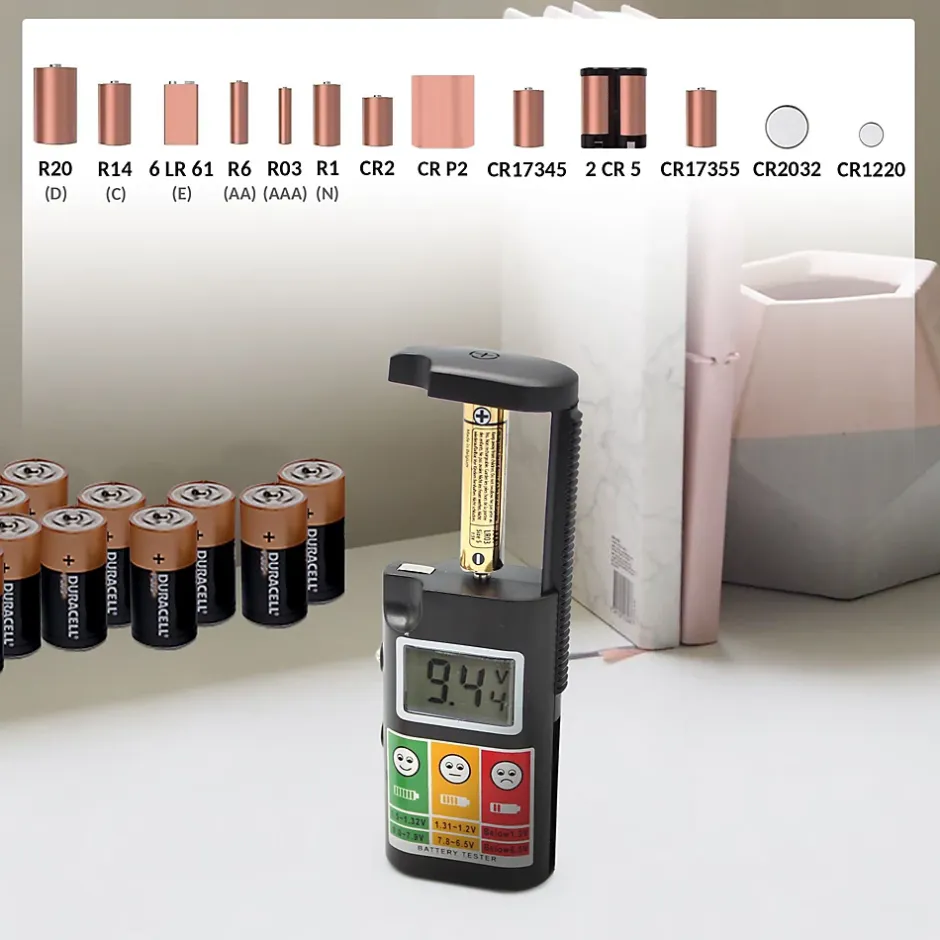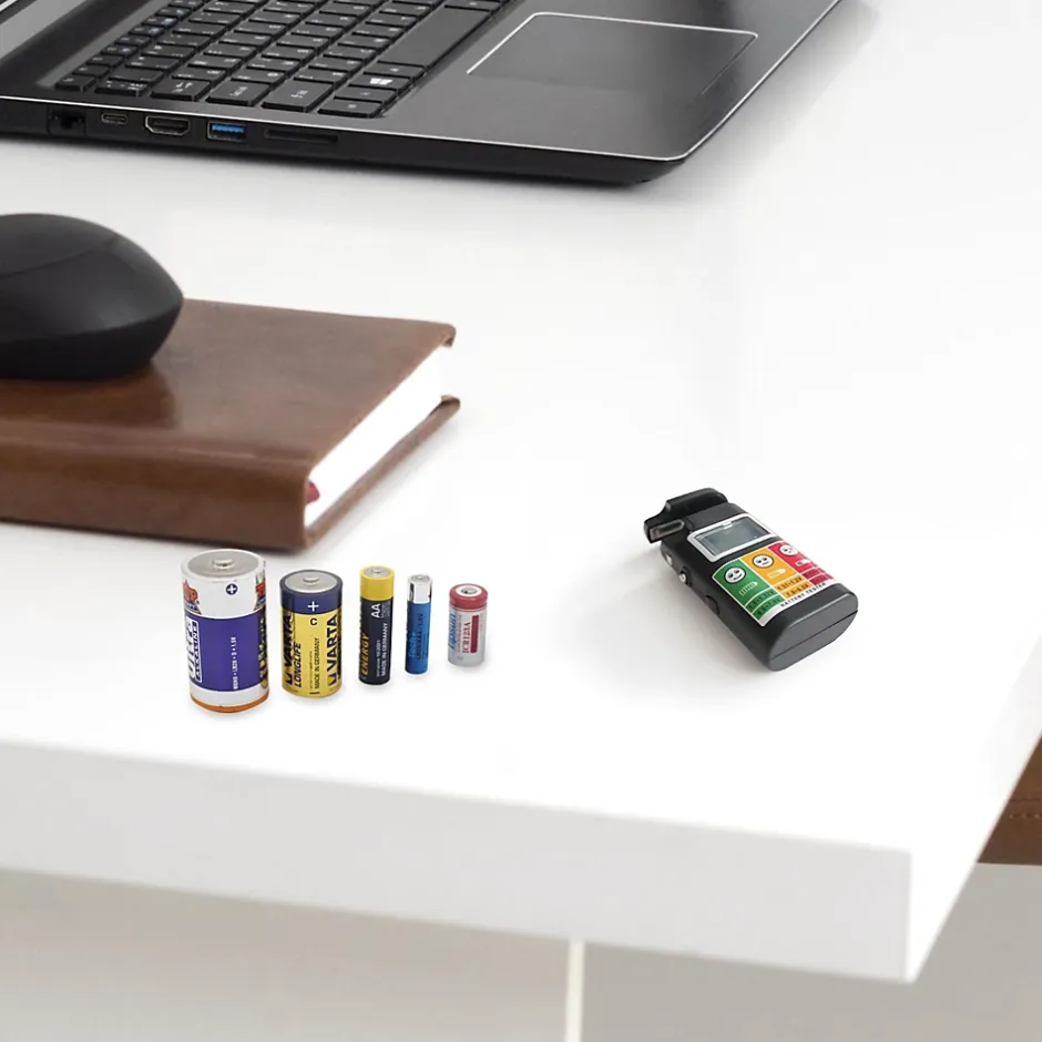 ? – Testeur universel s : Testez tous les types de piles alcalines de 1,5V et 9V, y compris les piles AAA, AA, C, D, 9 volts (block) et les piles boutons LR44.? – Puissance : Doté d’un grand écran, ce testeur vous indique avec précision la valeur exacte de la puissance restante dans la pile testée. Facile à utiliser, il vous suffit de positionner la pile sur l’emplacement dédié du testeur et d’appuyer sur le bouton de test pour que la valeur s’affiche immédiatement sur l’écran.? – Pratique grille de lecture colorée : La grille de lecture claire et colorée vous permet de connaître rapidement l’état de la pile. Si la valeur se situe dans la zone verte, la pile peut continuer de servir. Si elle est dans la zone orange, elle commence à faiblir, mais vous pouvez encore l’utiliser ou la recharger avec un chargeur adapté. Si la valeur se trouve dans la zone rouge, la pile est quasiment vide et doit être recyclée.? – Compact et portable : Avec ses dimensions de 9 x 5 x 2,8 cm (fermé) et son poids de seulement 45 g, ce testeur est compact et se range facilement dans un tiroir. Vous pouvez le garder à portée de main pour tester vos piles à tout moment.? – Caractéristiques : Matière : ABS – Dimensions : 9 x 5 x 2,8 cm (fermé) – Poids : 45 g – Alimentation : 2 piles AAA (non incluses) – Compatible avec les piles : R3 (AAA), R6 (AA), R14 (C), R20 (D), 9 volts (block), piles boutons LR44 – Certification CE, RoHS