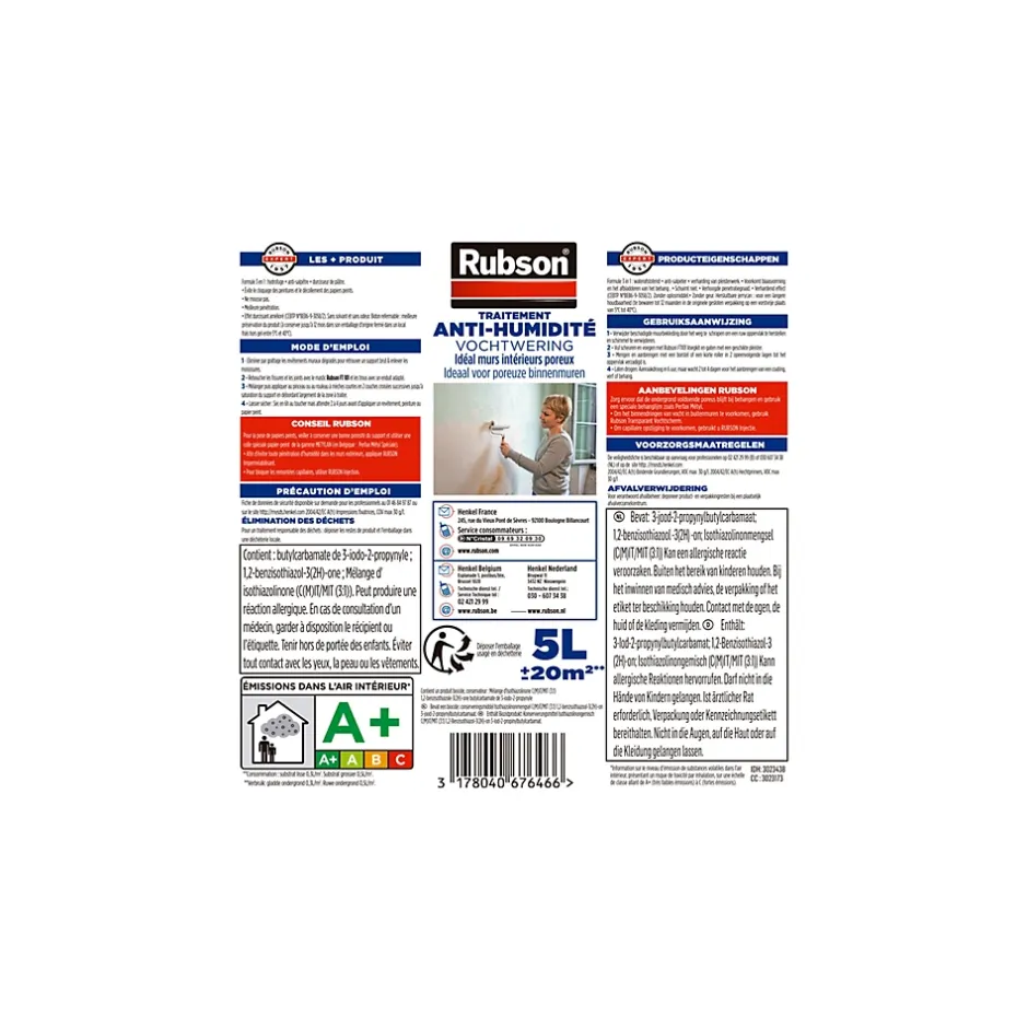 RUBSON Traitement Murs Humides est la solution hydrofuge pour les murs humides de la maison. Le Traitement Murs Humides de RUBSON est idéale pour débarrasser les murs intérieurs humides du salpêtre avant d’effectuer des travaux de peinture ou la pose de papier-peint tout en étant un durcisseur de plâtre. La formule aqueuse et sans solvant du produit combinée à une résine acrylique est blanc laiteux à l’application mais incolore une fois sèche. Cet apprêt est sec au toucher après 6h de pose et il est possible d’appliquer un revêtement ou de peindre le mur traité après 2 à 4 jours de séchage. 1 litre de produit traite environ 6 m². Appliquez la solution hydrofuge au pinceau ou au rouleau en deux couches croisées successives en débordant largement de la zone à traiter. Attendre 2 à 4 jours avant d’appliquer revêtement, peinture ou papier-peint.