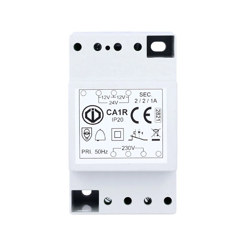 Transformateur 12/24 V 1/2 A – Classe II – CA1R – CDVILe transformateur 12/24 V 1/2 A – Classe II – CA1R de CDVI est un dispositif polyvalent offrant deux options de puissance de sortie : 12 V AC ou 24 V AC, permettant ainsi de choisir la tension appropriée pour alimenter les appareils spécifiques. Grâce à son enroulement secondaire, il offre une flexibilité supplémentaire dans les applications. Son installation est aisée dans des espaces restreints grâce à ses dimensions compactes. Avec un indice de protection IP54, il est résistant à la poussière et aux projections d’eau, ce qui le rend adapté pour une utilisation en intérieur ou en extérieur dans diverses conditions environnementales. Conforme à la Classe II, il bénéficie d’une isolation électrique renforcée, garantissant une sécurité maximale lors de son utilisation. Le transformateur CA1R de CDVI est une solution fiable, sécurisée et polyvalente pour alimenter vos appareils électroniques avec précision et efficacité.Caractéristiques principales :Entrée: 230 V +/- 10%, 50/60 HzSecondaire 4/8/12 V ACDimensions (L x B x H): 81 x 56 x 43 mmEntrée : 230 V +/- 10 %, 50/60 HzIndice de Protection : IP54