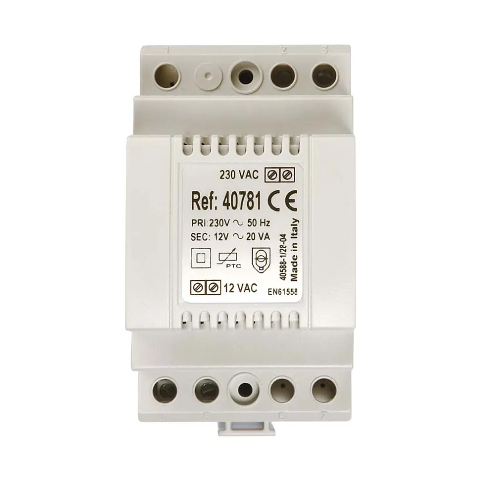 Transformateur 230 Vac / 12 Vac – 1,5 A – AIP/40781 – AIPHONELe transformateur AIP/40781 d’AIPHONE alimente en toute fiabilité les dispositifs tels que les gâches électriques et les claviers. Il accepte une tension d’entrée de 230 Vac et produit une tension de sortie de 12 Vac à 1,5 A. Il s’installe facilement sur un rail DIN de 3 modules ou par vis grâce à ses dimensions compactes de 52x100x70 mm, convenant aux boîtiers électriques standards. C’est un choix sûr pour l’alimentation électrique.Caractéristiques principales :Transformateur 230 Vac /12 Vac – 1,5 AFixation par rail DIN 3 modules ou par visTransformateurs pour gâches et/ou claviersHauteur : 100,00 mmLargeur : 52,00 mmÉpaisseur : 70,00 mm
