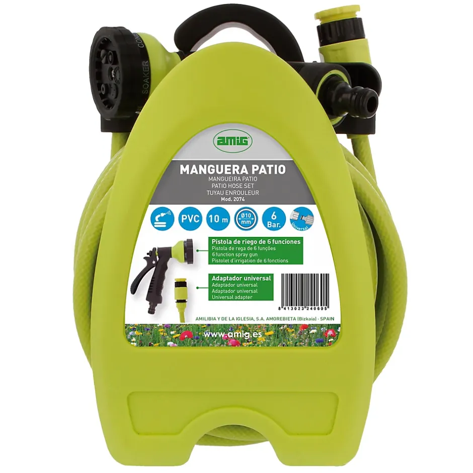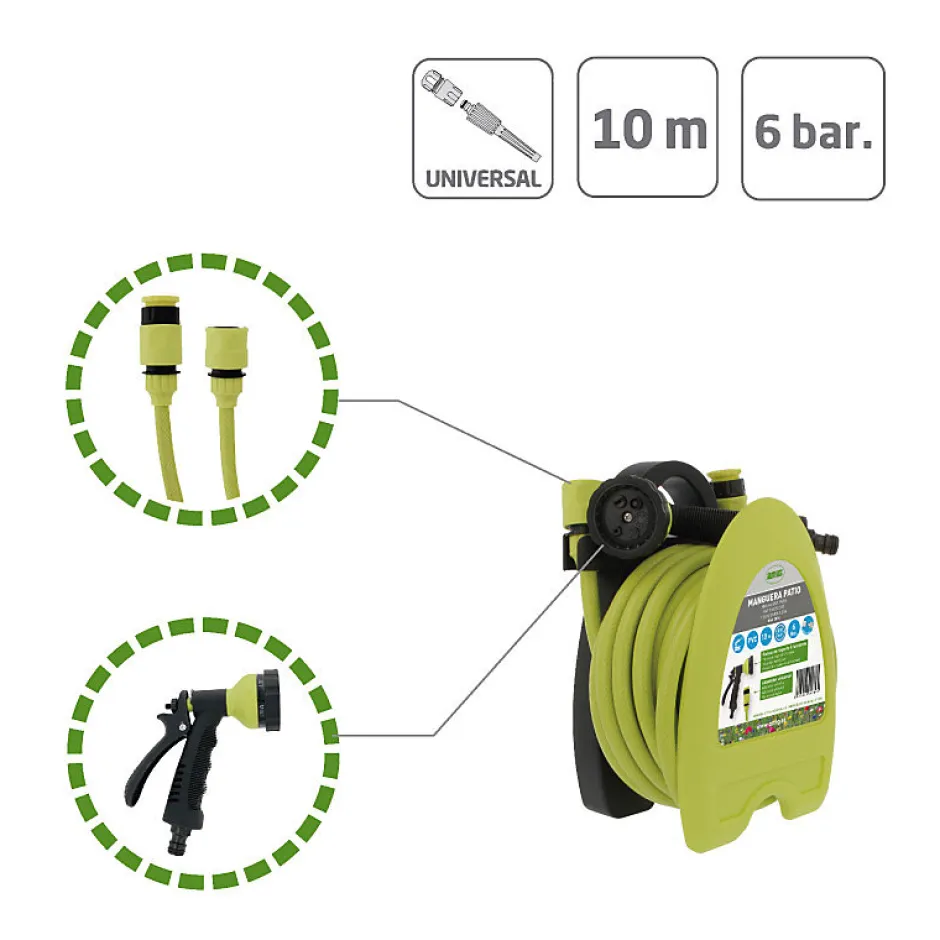 Tuyau de patio en PVC. Connecteur de robinet universel réglable. Pistolet d’arrosage a 6 fonctions. Support d’accrochage. Anse de transport.