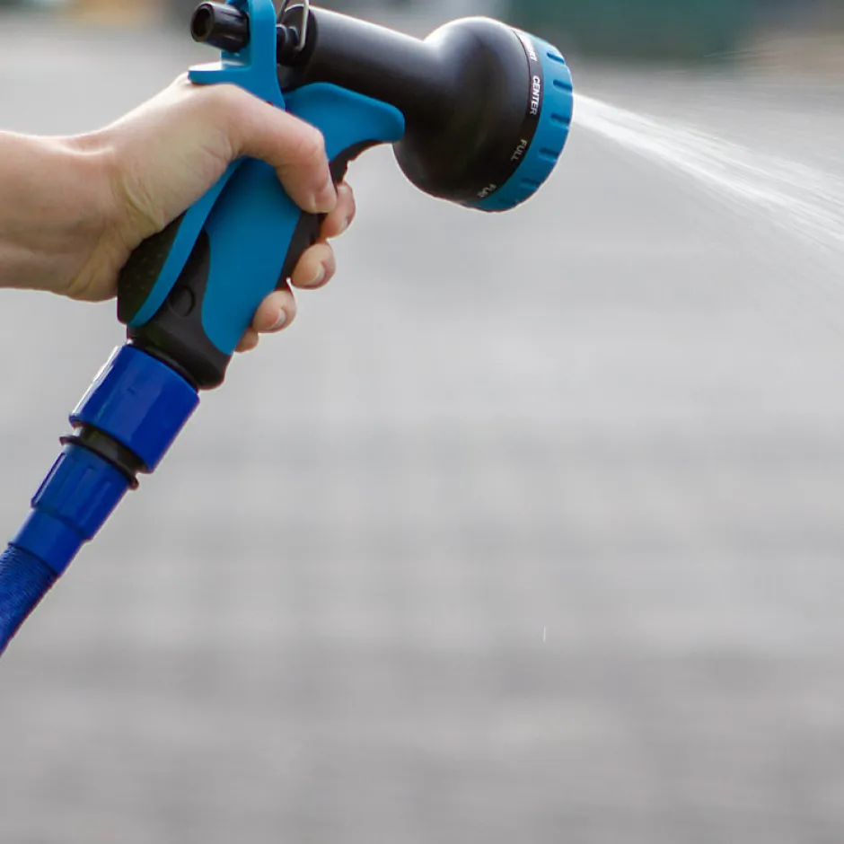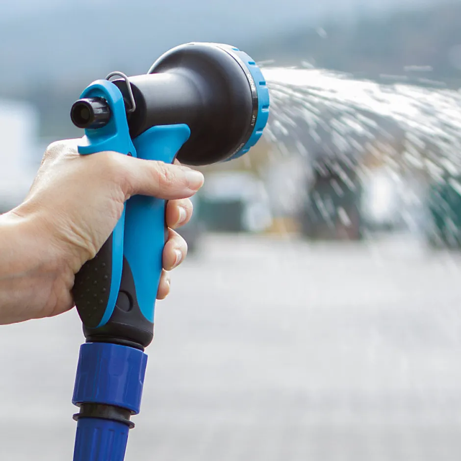 Tuyau extensible en double latex de couleur bleue. Atteint 15 mètres de longueur maximum. Pression maximale jusqu’a 6 bars. Pistolet d’arrosage a 9 fonctions. Avec des accessoires.