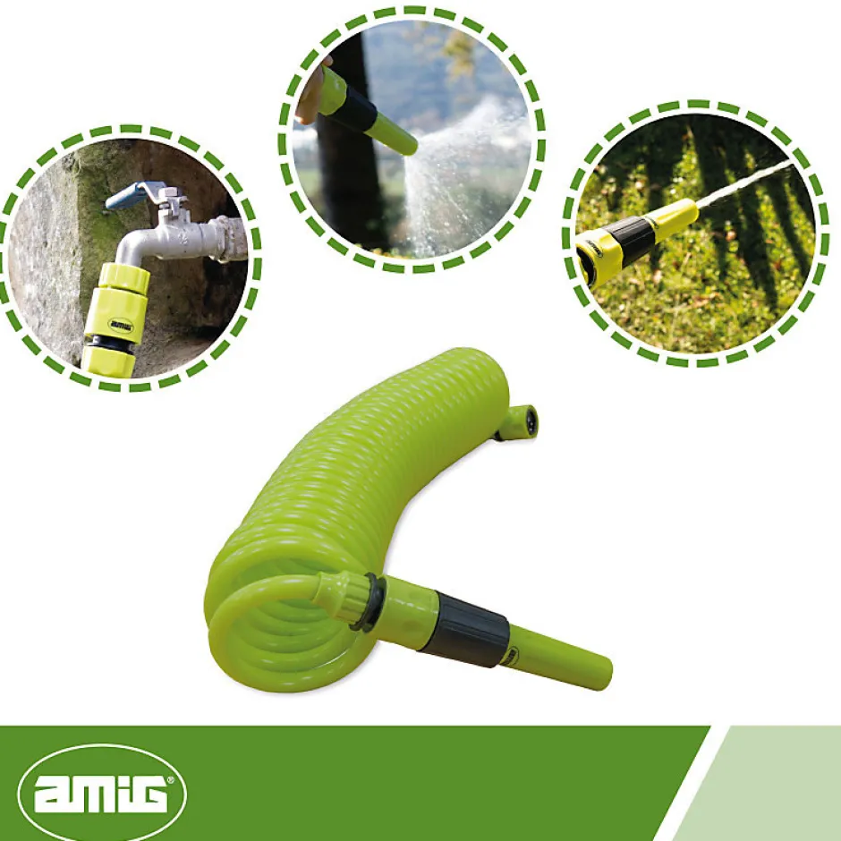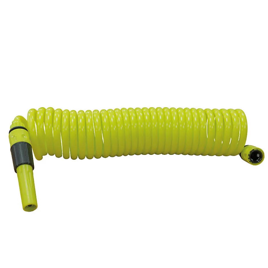 Tuyau en spirale de 3/8 ». Avec des accessoires. Lance d’arrosage. Adaptateur robinet. 2 raccords rapides.