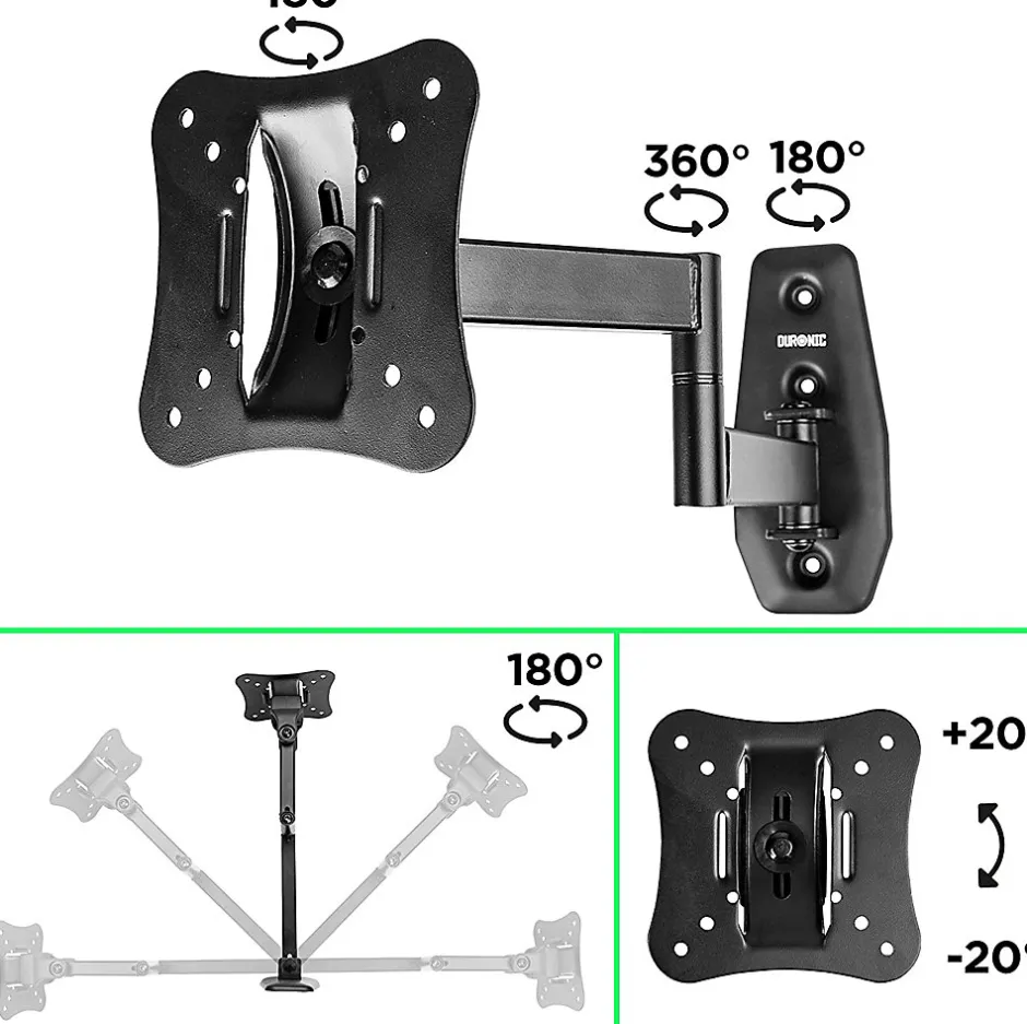 Le design de ce support réduit la distance de l’écran par rapport au mur à 78 mm et permet de décaler l’écran de 393 mm pour offrir une solution idéale aux pièces où vous ne souhaitez pas que l’écran se démarque du mur tout en offrant la flexibilité de déplacer l’écran selon les besoins, notamment si l’écran est placé dans un coin.Produit avec des feuilles d’acier en métal très solides pour offrir une solidité hors-pair, ce support permet une charge de 18 kg. Compatible avec tous les écrans dont la taille est comprise entre 13 et 30 pouces / 33 et 76 cm avec la norme VESA 100, 75 ou 50.Ce support s’incline de -20°/+20° afin de vous permettre d’installer votre écran en hauteur pour un meilleur confort de vue. Livré complet en une seule pièce avec accessoires de montage.Une fois la télévision montée, les possibilités d’ajustement permettent de placer l’écran selon l’angle souhaité à 360° grâce au bras repliable ou de rectifier l’angle de vision de +/-40°. Ce modèle étant orientable latéralement, il représente donc le meilleur choix si vous souhaitez monter votre télévision dans un coin ou souhaitez modifier l’angle de vision à la volée en fonction de votre installation.