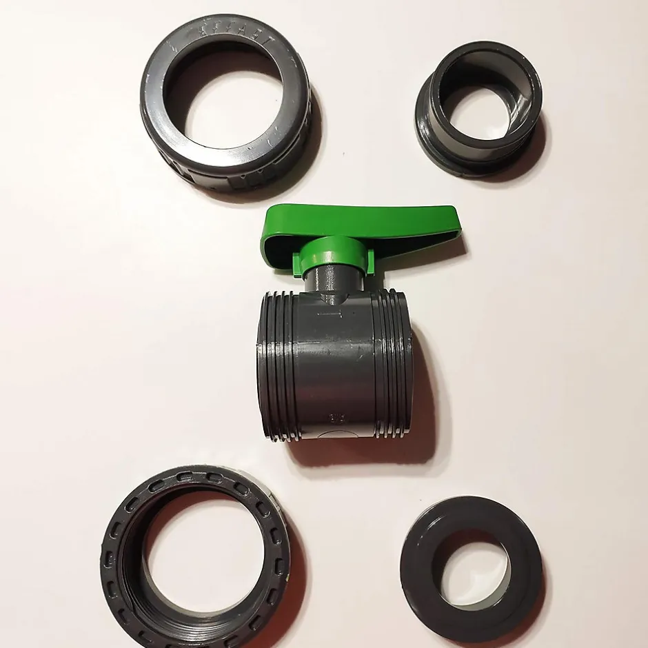 Vanne à sphere double union – raccordement femelle à coller.Vanne pour tuyaux 50mm 5cm D50 – 1p1/2″ – DN40 – PN16Sièges en PE, joint torique NBR / Nouvelle poignée ergonomique ! EffastTempérature : 60°C maxUtilisation : Adduction d’eau potable, irrigation, arrosage, réseaux de piscine, industrie chimique et alimentaire, etc.