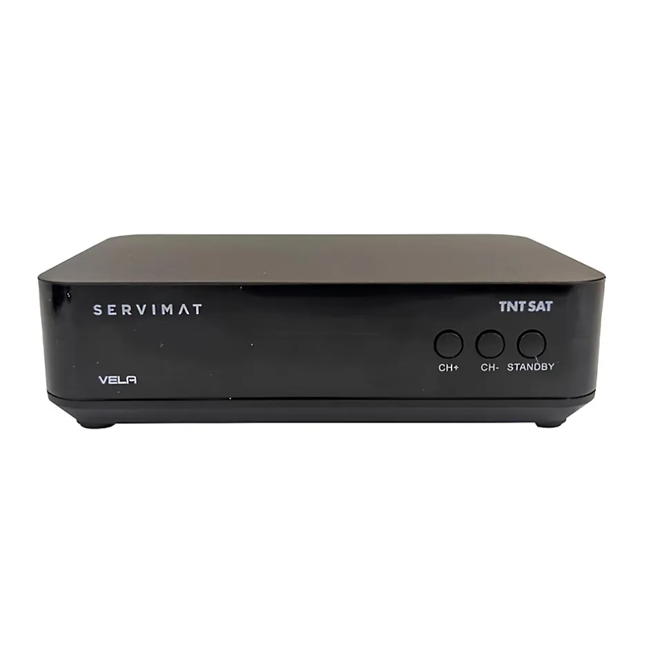 Description du produit : Servimat VELA HDLe Servimat VELA HD est un démodulateur satellite conçu pour recevoir gratuitement les chaînes de la TNT via le satellite Astra 19.2°E grâce au service TNTSAT. Ce terminal de réception offre une qualité d’image en haute définition et une utilisation intuitive grâce à son afficheur et sa télécommande ergonomique.Livré avec une carte TNTSAT, il permet d’accéder immédiatement aux programmes sans abonnement, garantissant une expérience TV fluide et sans contraintes. Sa conception compacte et son alimentation externe en font un équipement idéal pour une installation à domicile ou en mobilité (camping-car, caravane, etc.).Caractéristiques techniques :Type de réception : TNT gratuite par satellite via TNTSAT (Astra 19.2°E)Affichage : Écran en façade pour une navigation simplifiéeAccessoires fournis :1 carte TNTSAT (valable 4 ans pour l’accès aux chaînes gratuites)1 bloc d’alimentation1 télécommande ergonomique2 piles AAA1 notice d’installationSorties vidéo : HDMI, Péritel (compatibilité avec anciens téléviseurs)Compatibilité : Adapté aux installations fixes et mobiles (camping-cars)Alimentation : Bloc externe 220VLe Servimat VELA HD est un choix parfait pour ceux qui souhaitent profiter des chaînes de la TNT en toute simplicité, avec une installation rapide et une compatibilité optimale.
