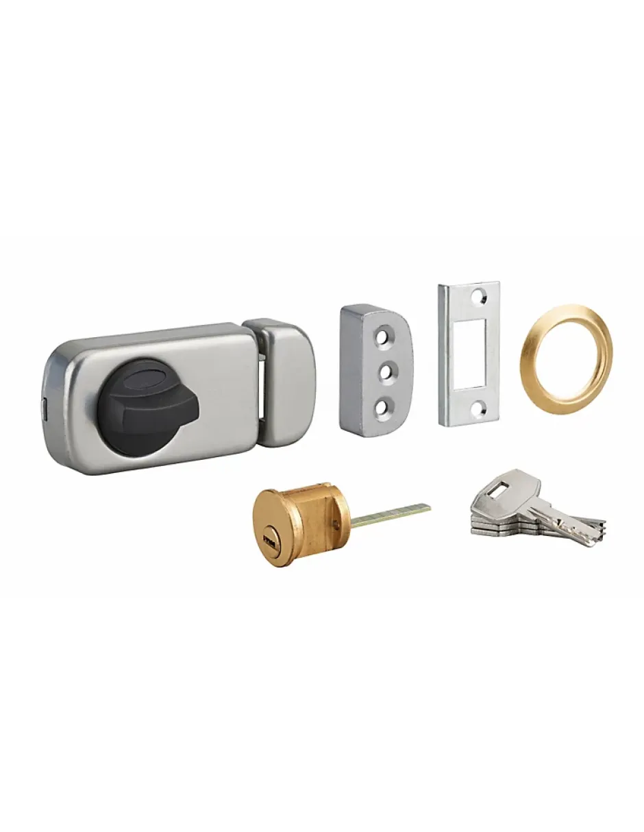 Verrou applique 1 point avec cylindre à languette recoupable. Livré avec gâches à encastrer / appliquer et câles pour porte à recouvrement. 4 clés réversibles.