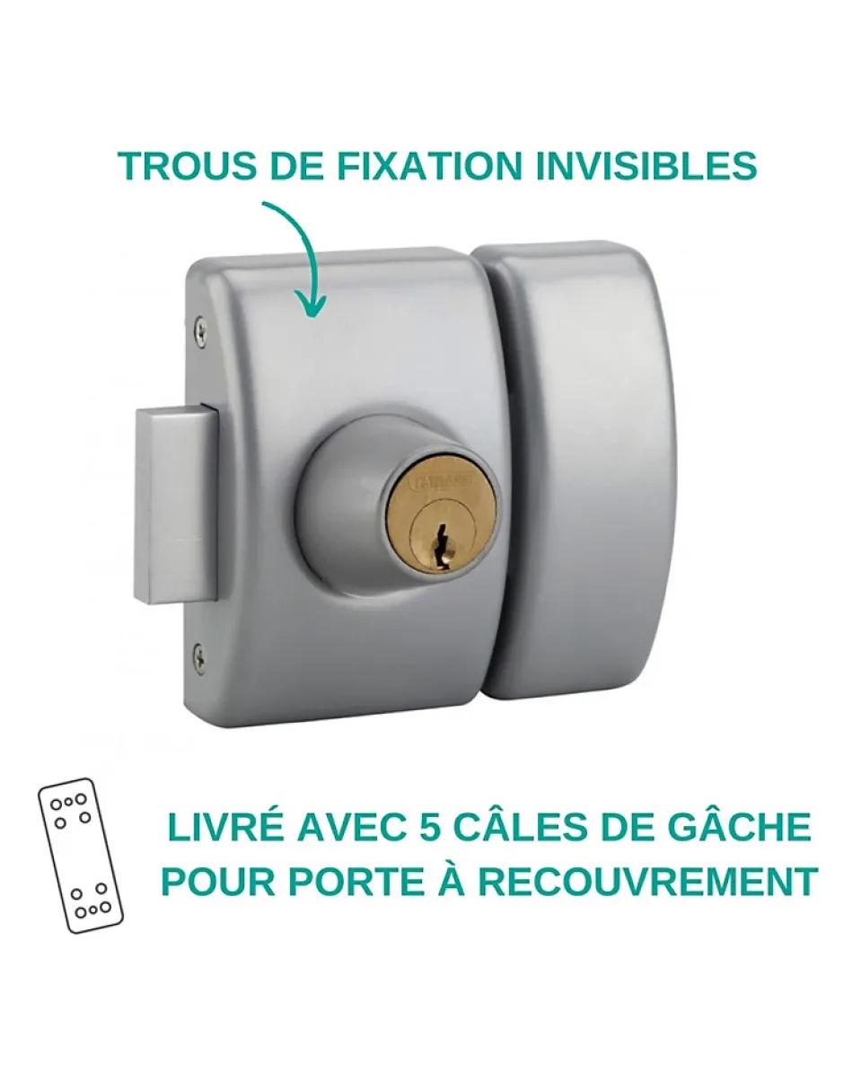 Les points Clés :Verrou à double entréeVerrou Design 5 Epoxy argentVerrou pour porte d’entrée vitréeHauteur du coffre 94 mmLargeur du coffre 60 mmCylindre Diamètre 23 mmCylindre Longueur 45 mmCylindre Laiton à 5 goupilles3 Clés Plates crantées