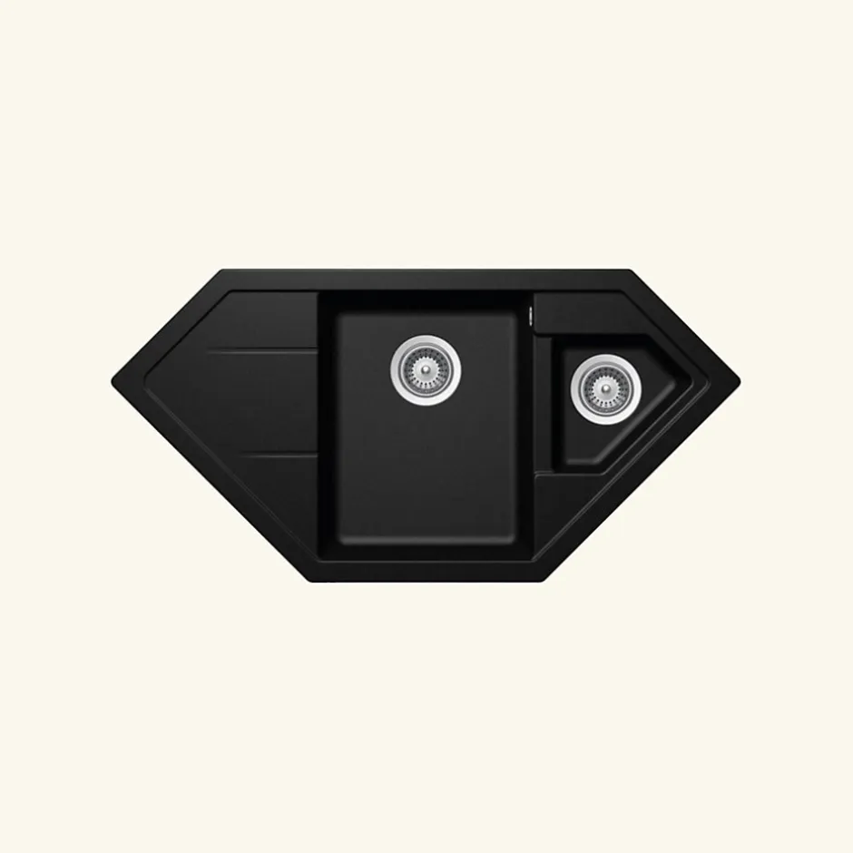 <p•• Vidage automatique•• 2 bondes évier 114 mm, trou évier 90 mm•• Trop plein rond•• Siphon gain de place