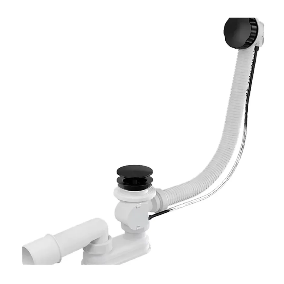 Vidage baignoire avec trop-plein – Bonde noire – FlexibleCe vidage de baignoire avec trop-plein permet une évacuation efficace de l’eau tout en offrant une installation simple et fiable. Grâce à son mécanisme à câble, l’ouverture et la fermeture de la bonde s’effectuent facilement depuis la commande située au niveau du trop-plein.La bonde en finition noire apporte une touche moderne et discrète qui s’intègre parfaitement dans les salles de bain contemporaines. Le flexible de liaison facilite l’installation et permet un raccordement adaptable entre la bonde et le trop-plein.Doté d’une sortie d’évacuation standard, ce vidage est compatible avec la majorité des installations domestiques. Il constitue une solution pratique pour équiper une baignoire lors d’une nouvelle installation ou pour remplacer un système existant.Dimensions et caractéristiques du produitType : Vidage de baignoire avec trop-pleinFinition bonde : NoirLongueur du flexible : 65 cmDiamètre de bonde : Ø 72 mmHauteur minimale sous baignoire : 10,6 cmSortie d’évacuation : Ø 40 / 50 mmCommande : Mécanisme à câbleCompatibilité : Baignoires standards