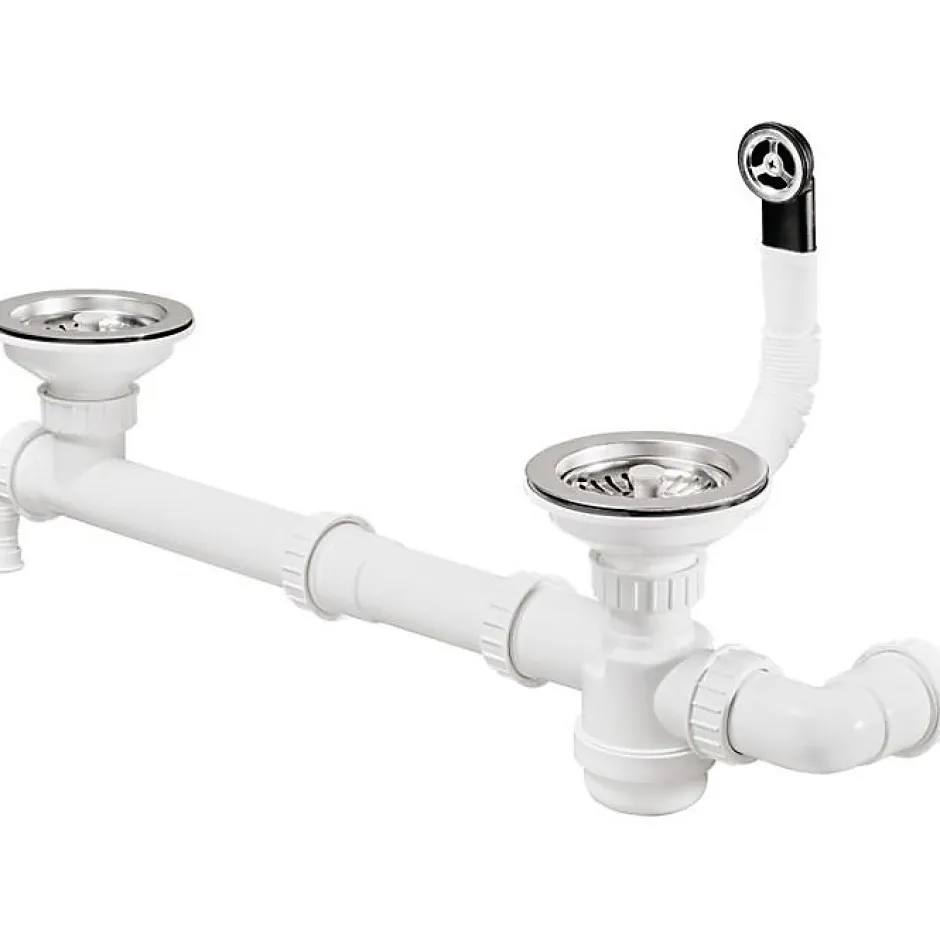 Vidage manuel évier 1 cuve Ø90mm avec trop plein rond Ø28mm, bonde à panier chromée, tube de trop plein extensible L325mm maxi, évacuation pour tuyau Ø40mm et prise machine à laver