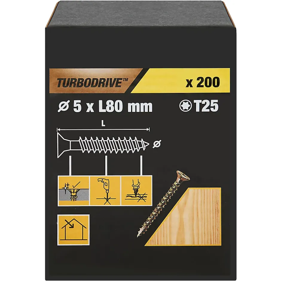 Les 200 vis à bois premium zinguées jaunes à double tête fraisée de ce pack sont fabriquées à partir d’acier. Elles mesurent 80 mm de long et ont un diamètre de 5 mm. Elles sont idéales pour tout un éventail de projets de bricolage.