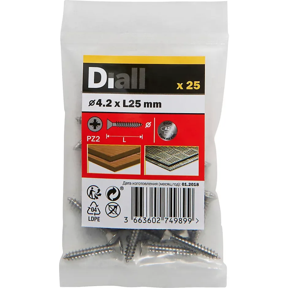 Les 25 vis auto-taraudeuses fraisées de ce pack sont fabriquées à partir d’acier inoxydable. Elles mesurent 25 mm de long, ont un diamètre de 4,2 mm et sont entièrement filetées. Elles sont idéales pour tout un éventail de projets de bricolage.