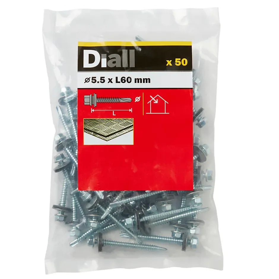Vis de bardage. . Longueur du produit : 60 mm. Diamètre du produit : 5,5 mm. Type de filetage : Auto-perçant. Type embout : Pointe trempée. Quantité par pack : 50.
