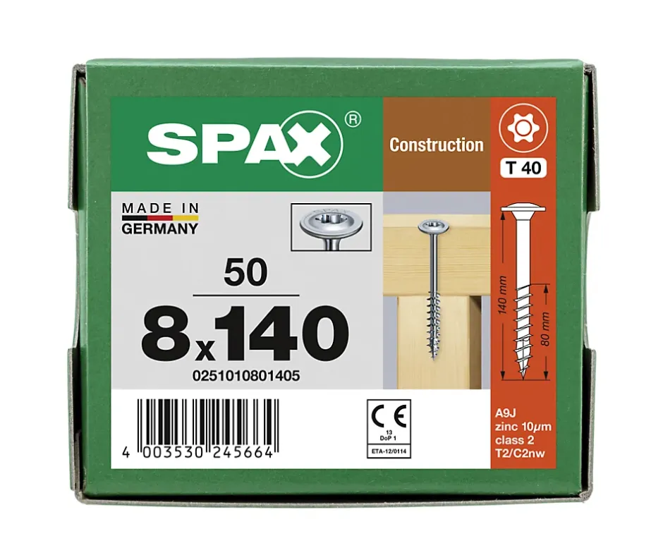 Vis de charpente tête ronde Spax Wirox 8 x 140 mm filetage partiel – 50 pièces