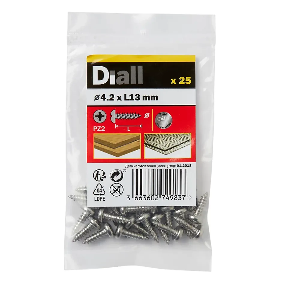 Les 25 vis auto-taraudeuses à tête cylindrique de ce pack sont fabriquées à partir d’acier inoxydable. Elles mesurent 13 mm de long, ont un diamètre de 4,2 mm et sont entièrement filetées. Elles sont idéales pour tout un éventail de projets de bricolage.