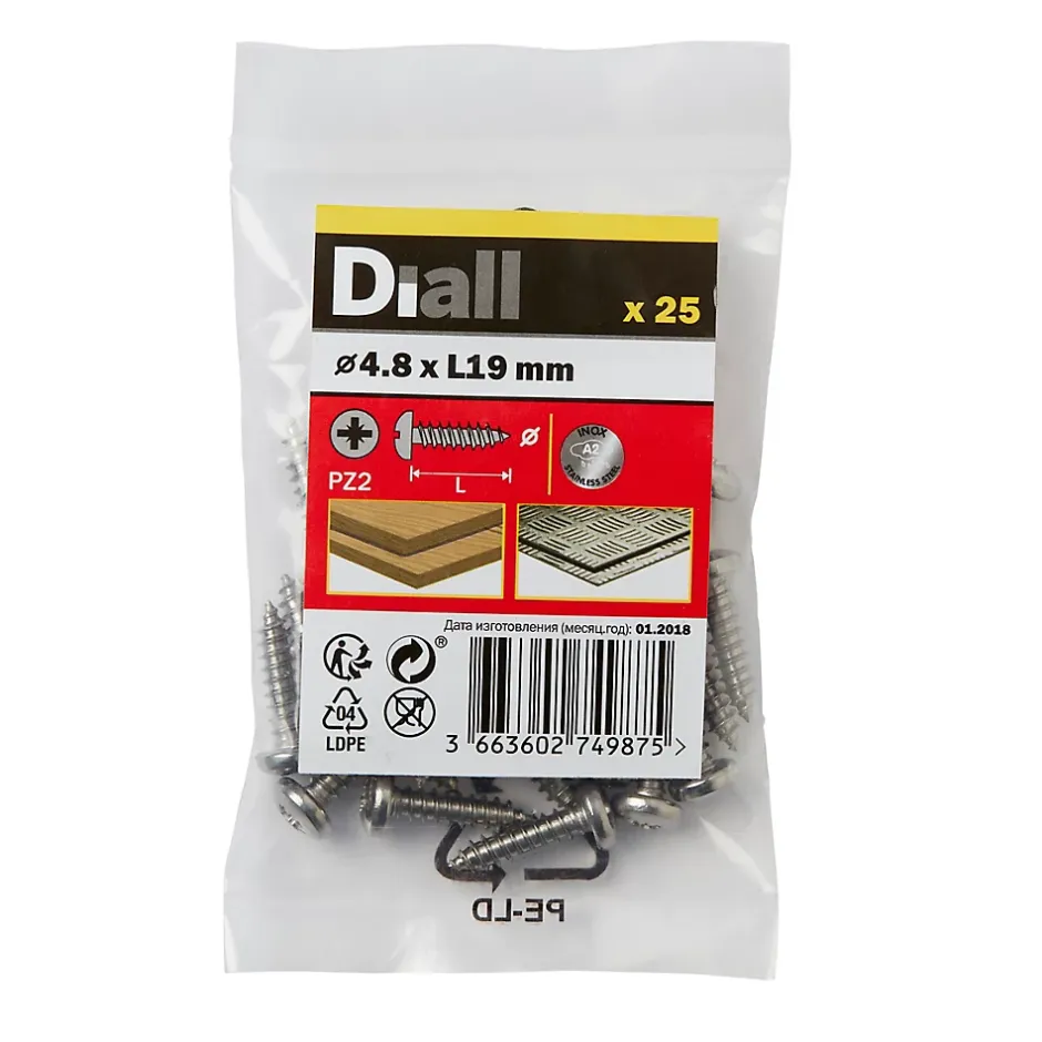 Les 25 vis auto-taraudeuses à tête cylindrique de ce pack sont fabriquées à partir d’acier inoxydable. Elles mesurent 19 mm de long, ont un diamètre de 4,8 mm et sont entièrement filetées. Elles sont idéales pour tout un éventail de projets de bricolage.