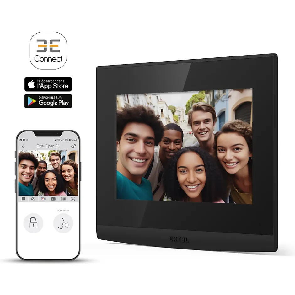 Facilité d’installation et d’utilisationAvec son installation sur deux fils, Extel Open 3K est adapté à un remplacement de visiophone ancien dans le cas de travaux de rénovation. La fonction Polarity Protect sécurise votre appareil contre tout mauvais branchement. Enfin, la distance maximale de 100 mètres permet à Extel Open 3K de s’adapter à toutes les configurations de domicile. Qualité d’image à 3KObtenez une vision nette et fluide en toutes circonstances sur votre moniteur ou votre smartphone grâce une haute qualité d’image en 3K. Avec la vision nocturne (LEDs infrarouges), continuez d’apercevoir vos visiteurs, peu importe la luminosité ambiante. Et même quand aucun visiteur ne sonne, restez vigilant sur les abords de votre domicile avec la présence de la fonction Door Check.Quatre modes d’accès à votre domicileAccédez à votre domicile avec quatre modes d’ouverture :l’écran tactile du moniteur (répondre au visiteur, ouvrir le portail ou le portillon)le code permanent ou temporaire sur le clavier à code de la platine de ruele smartphone (application Extel Connect) avec les mêmes fonctions que sur l’écran, à distancele QR code avec une durée de validité et des créneaux horairesUn visiophone connectéEn plus des fonctions classiques d’un visiophone connecté (notification d’un passage visiteur, consultation photos/vidéos à distance), Extel Open 3K permet de : créer un code temporaire pour le clavier de la platine de rue avec ses critères d’utilisationcréer un QR code d’accès avec