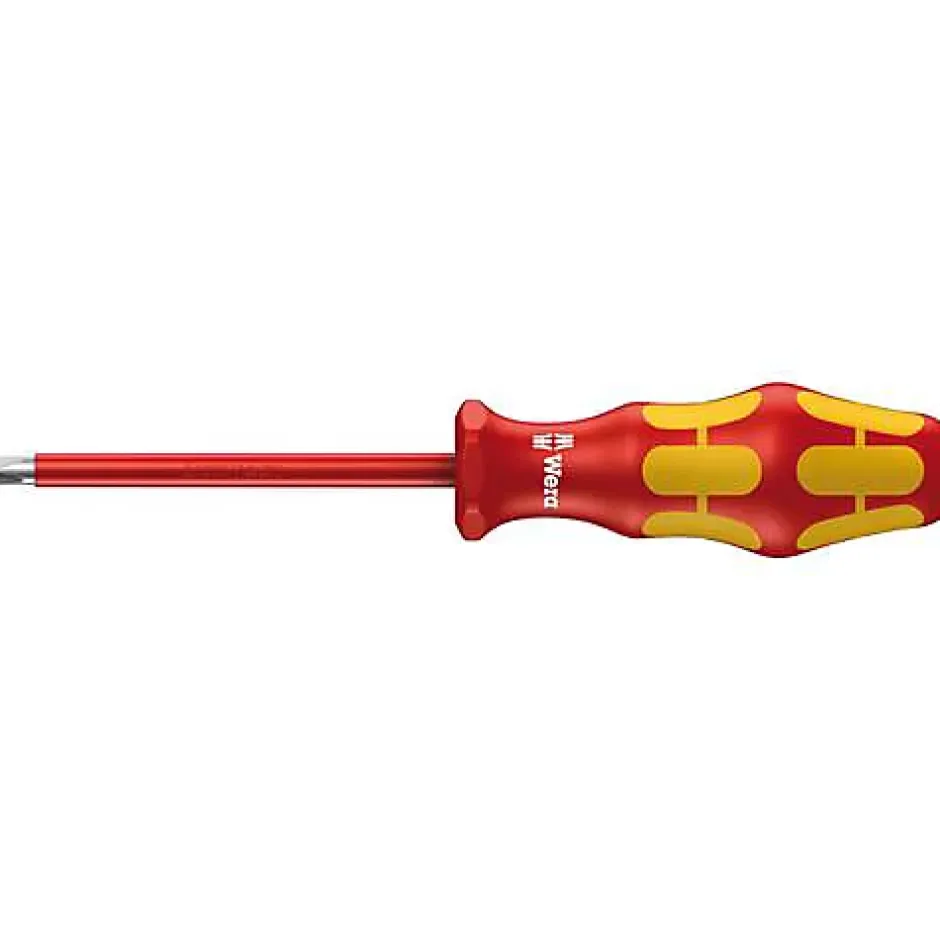 Tournevis isolé Wera 05006162001 PZ 1, longueur totale 178 mm, lame ronde isolée de 80 mm. Poignée Kraftform composite en PP/TPV, diamètre 33 mm, antidérapante pour un confort et un couple optimisés. Conforme VDE et normes DIN ISO 8764-PZ et EN 60900, lame en acier à outils nickelé, résistant à la corrosion. Idéal pour travaux électriques, électronique et mécanique de précision. Contenu : 1 tournevis.