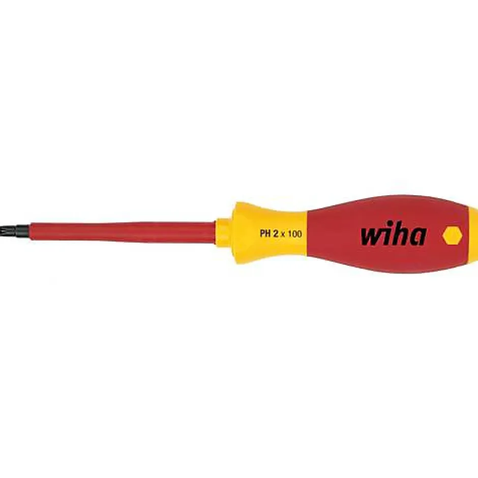 Tournevis VDE Wiha 00847 PH1, lame 80 mm, isolation jusqu’à 1 000 V AC et certification VDE/GS. Manche ergonomique SoftFinish en PP/TPV pour une prise sûre, lame en acier Chrome-Vanadium-Molybdène trempé et finition brune, sortie Phillips PH1, longueur totale 191 mm, poids 95 g. Idéal pour travaux électriques, électronique et atelier. Contenu : 1 pièce.