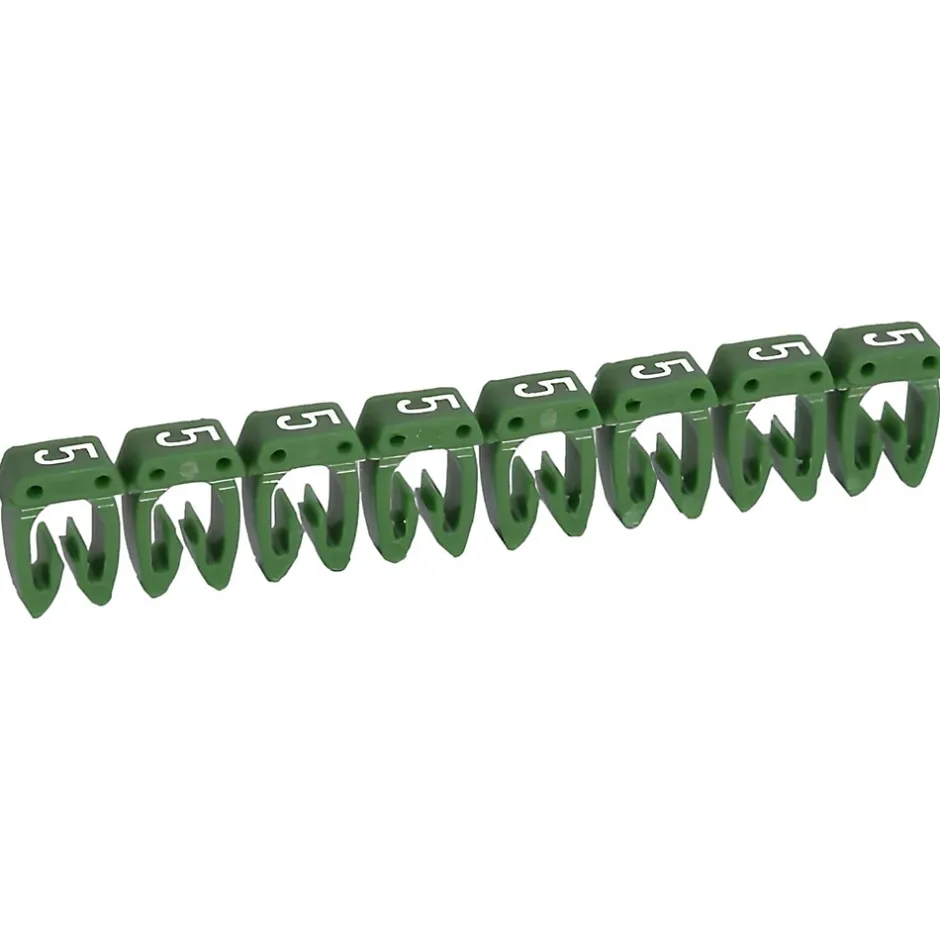Bagues de repérage pour fil – Marqué Chiffre 5 – Couleur Vert Ces Repères de câbles sont fabriqués en France par Legrand, ils sont issus de la gamme CAB3. Ils sont très utilisés par les professionnels, les fabricants de machines spéciales et les tableautiers. Ces repères Legrand 038215 respectent les codes couleurs internationaux.Ces repères marqués du Chiffre 5 en couleur Vert se clipsent sur des fils électriques de section 0,5 à 1,5mm² mais ils sont également compatibles avec les blocs de jonction Viking3 Legrand (3 repères maximum par bornes viking).Si vous avez besoin d’associer plusieurs repères sur un même fils, les marquages resteront parfaitement alignés grâce à un système de picots très pratique.Ces repères de filerie sont conditionnés par boite de 1200 repères en réglettes de 30 repères.L’essentiel des repères de filerie Legrand 038215 Chiffre 5 Couleur noir (code couleur international)Compatible avec fils de section 0,5 à 1,5mm² Compatible avec bornier Viking3 (3 repères maximum par bornes)Alignement parfait des repères grâce aux picotsBoite de 1200 repèresFabrication française