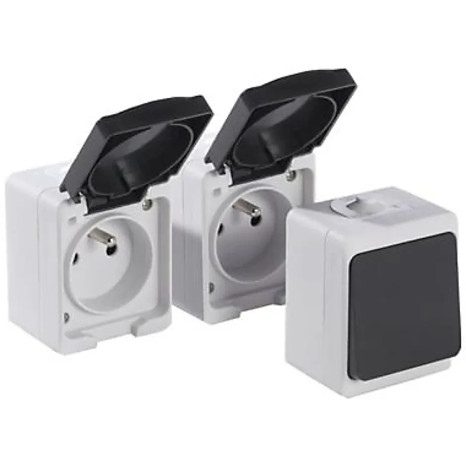 Ce lot composé d’un interrupteur va-et-vient et de 2 prises 2P+T 16A étanche est destiné aux installations électriques situées dans une cave, un garage ou un espace extérieur. Placé à l’intérieur, l’interrupteur permet d’allumer et d’éteindre les appareils reliés aux prises installées à distance