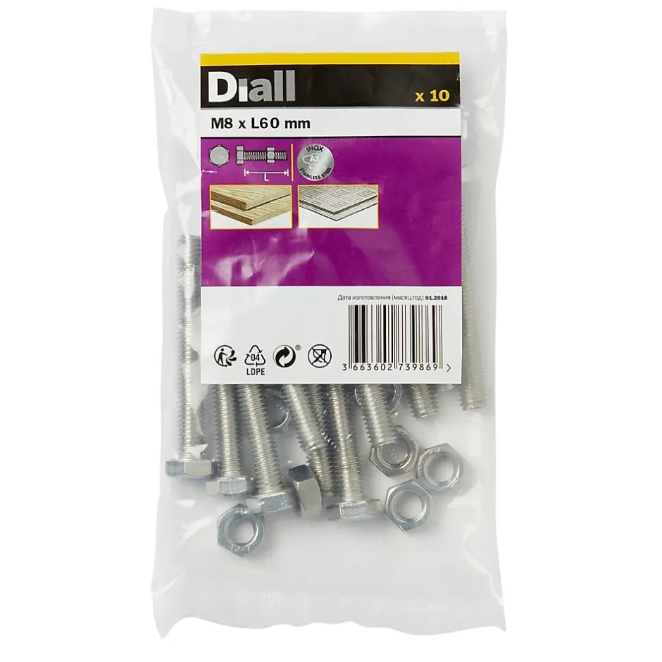 Les 10 boulons et écrous hexagonaux de ce pack sont fabriqués à partir d’acier inoxydable. Ils mesurent 60 mm de long et ont un diamètre M8. Ils sont idéaux pour tout un éventail de projets de bricolage.