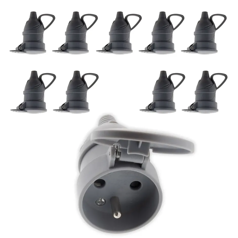 Fiche électrique femelle 2P+T 16A avec clape. Couleur(s) : gris. Puissance maximale : 3680 W sous 230 V. Compatibilité câble : HO5VV-F 3G1 / 3G1,5 mm². Clapet intégré : protection contre la poussière et les contacts accidentels. Certification : NF